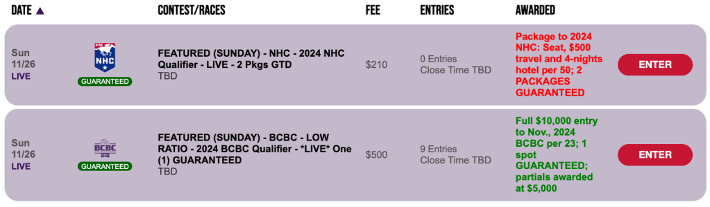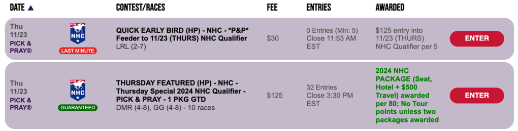 The Saturday NHC qualifying opportunity exists here at HorseTourneys via a $165 Pick & Pray with two seats certain. The winning ratio is 1-per-65.