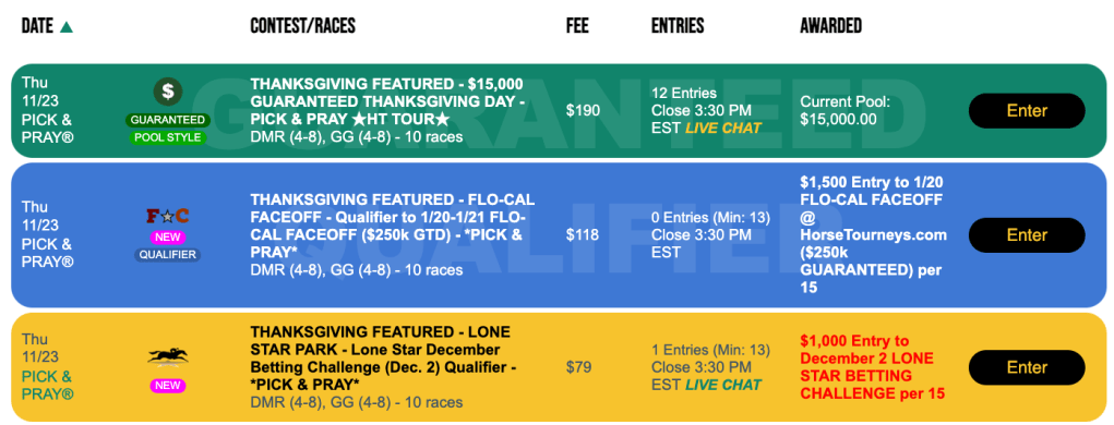 We’ll be hosting another qualifier on Saturday for the $250,000 Guaranteed Flo-Cal Faceoff—and there will also be one for the Fall Simulcast Challenge at Lone Star Park on December 2. The parameters for this Saturday Lone Star game are the same as the one on Thanksgiving—a $79 Pick & Pray with a winning ratio of 1-per-15.