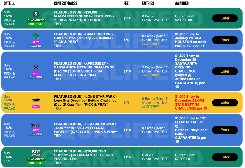 Another Sunday qualifier is that for the Fall Simulcast Challenge at Lone Star Park on December 2. Just like on Saturday, this one is a $79, 1-per-15 Pick & Pray, with the prize being a $1,000 entry.