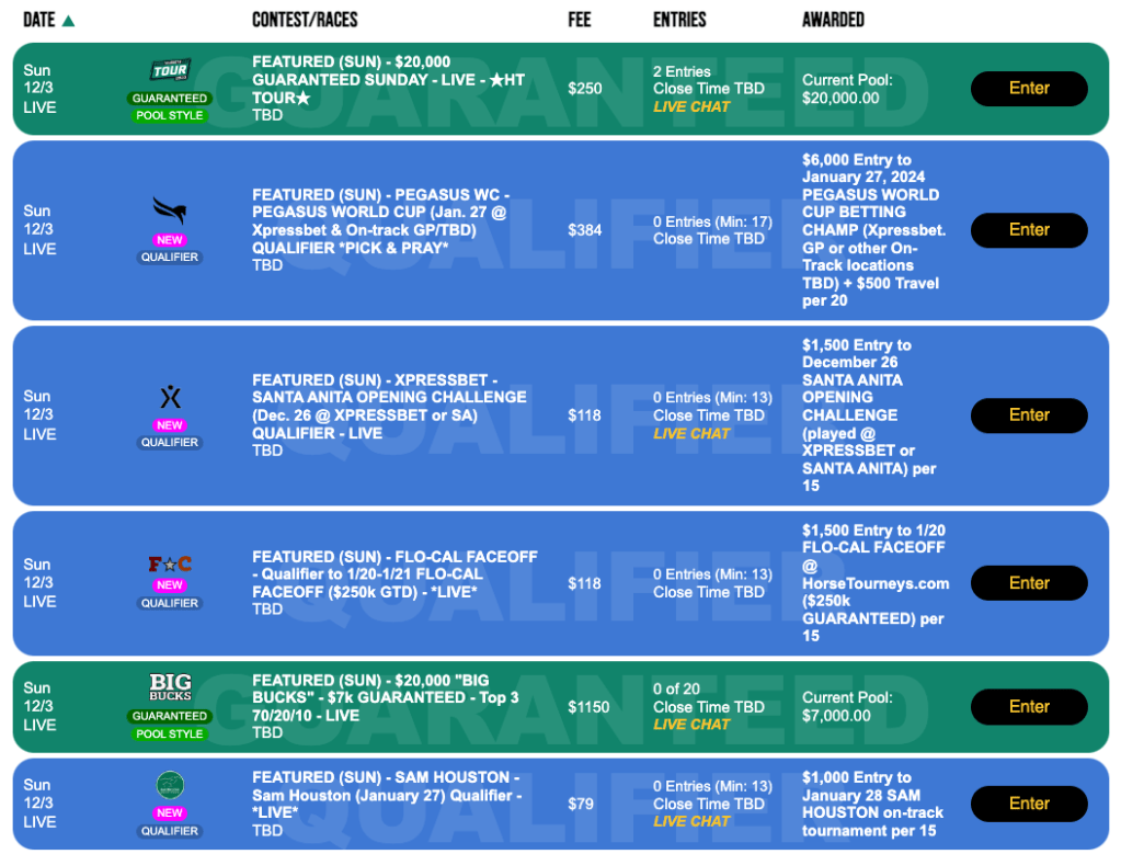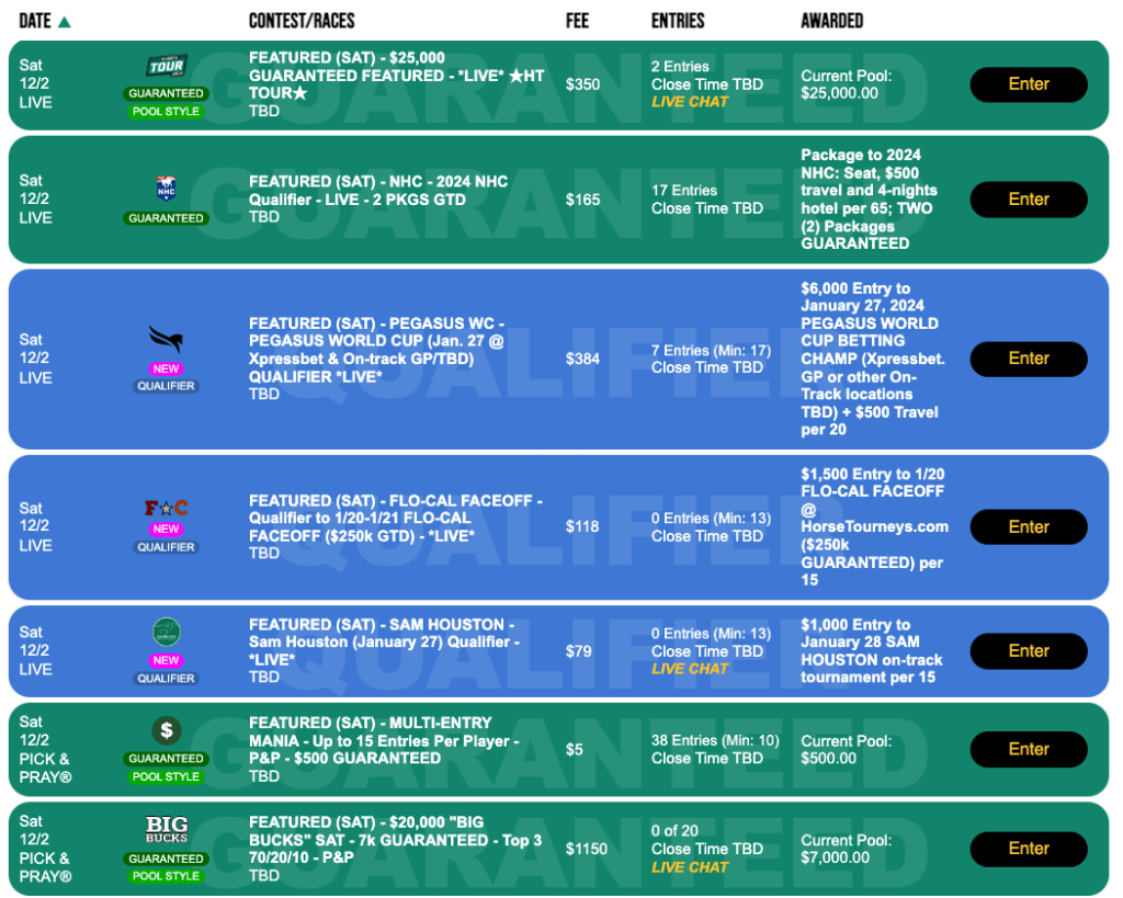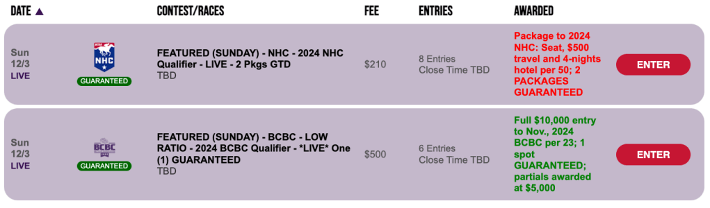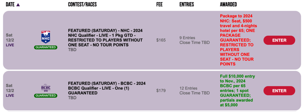 Also in Live, play-as-you-go mode at HorsePlayers is the day’s NHC play-in, but note that this $165, 1-per-65 get together is restricted to those who have yet to earn a 2024 seat. As such, no NHC Tour points will be awarded here. One Vegas berth is guaranteed to be awarded regardless of participation.