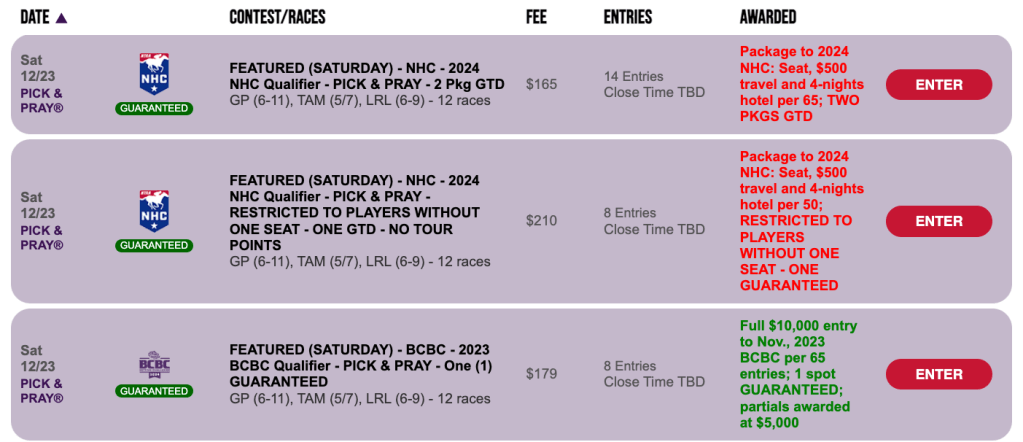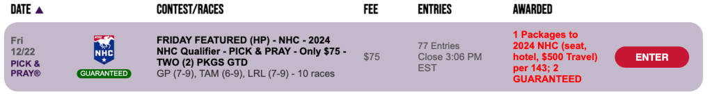The Christmas Eve NHC qualifier is here at HorseTourneys on Sunday, and it, too, is guaranteed with two seats certain in the prize pool. It’s a $165 Pick & Pray with a winning ratio of 1-per-65.