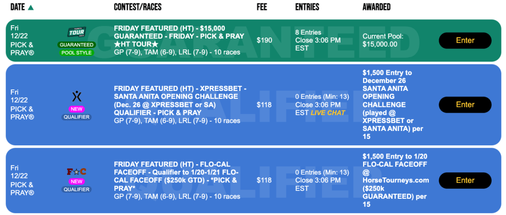 For the second straight day, there will be $118 Pick & Pray qualifiers for both the $250,000 Guaranteed Flo-Cal Faceoff and the Santa Anita Opening Day Challenge.