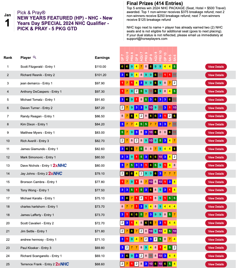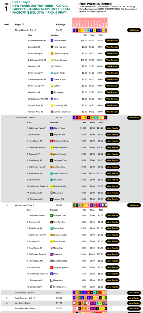First-place finisher Resnik was also one of five to earn seats in Monday’s $125 NHC qualifier at HorsePlayers.