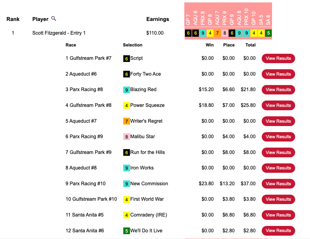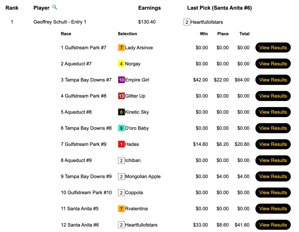 Gaffney’s slightly lower score of $123.30 here still prevailed by plenty. George Turner (2 firsts, 1 second) got the other NHC seat, and it was a wild ride on his way to that runner-up spot. He did all of his scoring in the final five races, including having Main Event ($25.00, $11.80) in the final contest race, the 11th at Gulfstream. That last winner got Turner up into second place by just 10 cents over a hard-luck Dave Cichy.