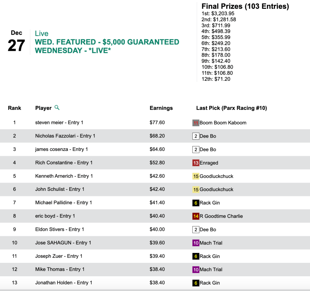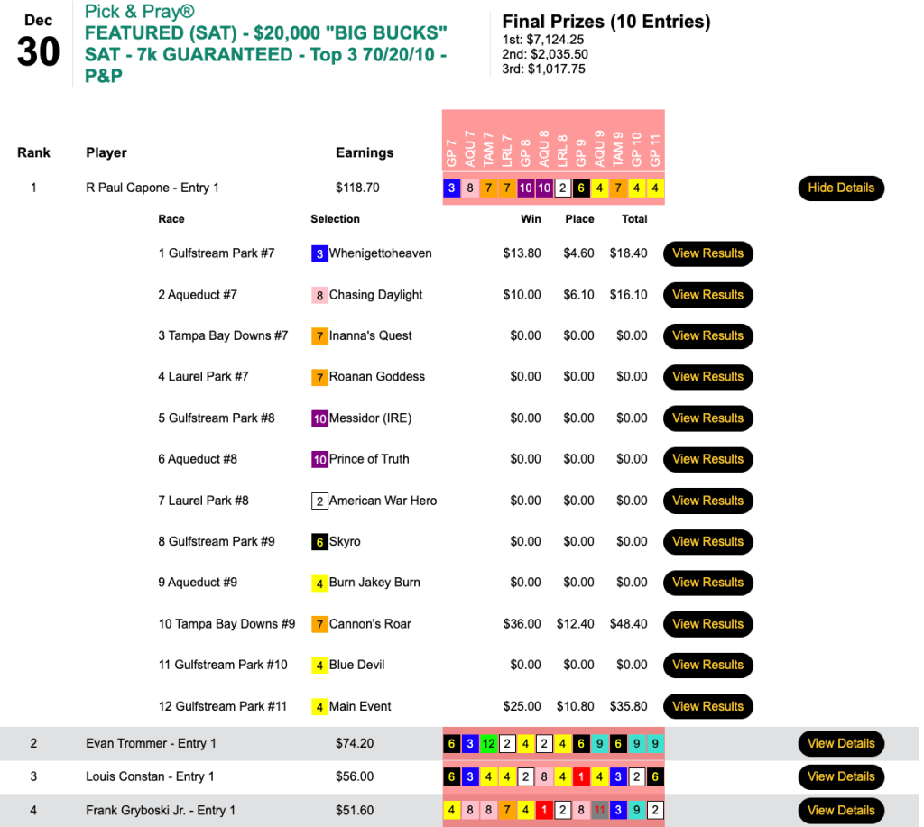 The Tampa 17-1 shot was one of 4 Saturday winners for Capone in Saturday’s $7,000 Gtd, Big Bucks Pick & Pray, which had a final prize pool of $10,177. Capone’s winner’s share came to $7,124.