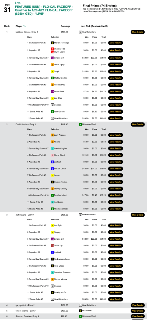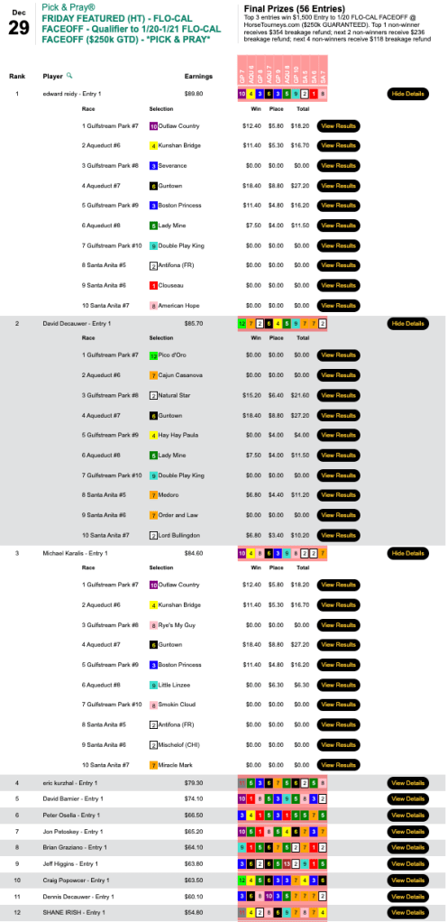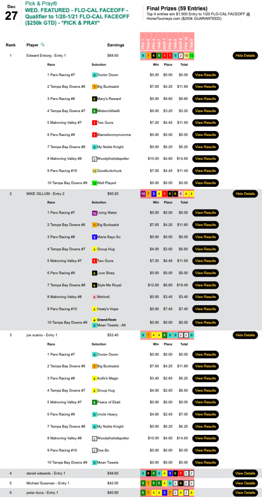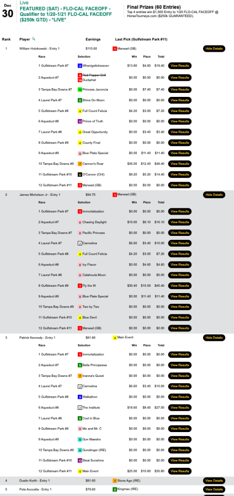 Meanwhile the 4th-place finisher in that Flo-Cal Faceoff qualifier won the $10,000 seat in the New Year’s Day Breeders’ Cup Betting Challenge Low Ratio play-in.