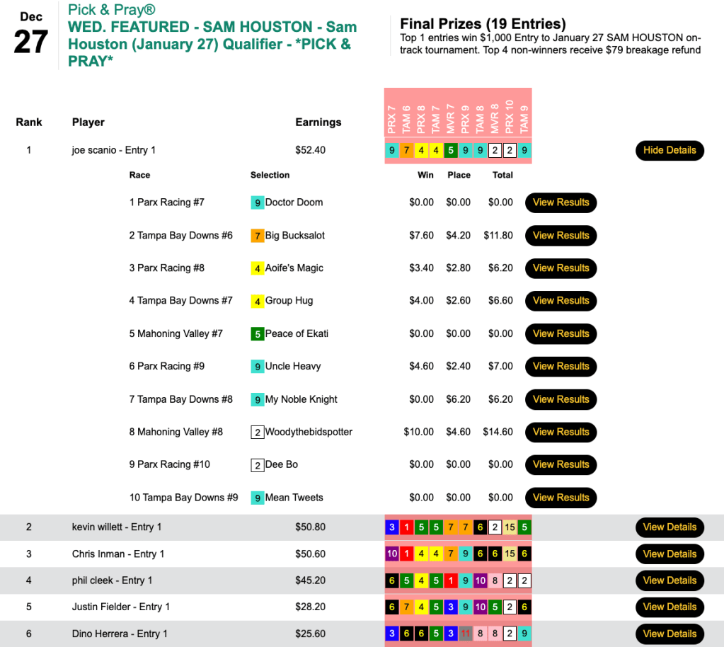 Cuellar used Heartfullofstars in this Live-format Houston Racing Festival Handicapping Contest qualifier even though he was nursing a slim $6.90 lead going into that final race. The courage of his convictions (or the fact that he was busy doing something else at the time on New Year’s Eve) certainly paid off for Cuellar, who finished $48.50 to the good.