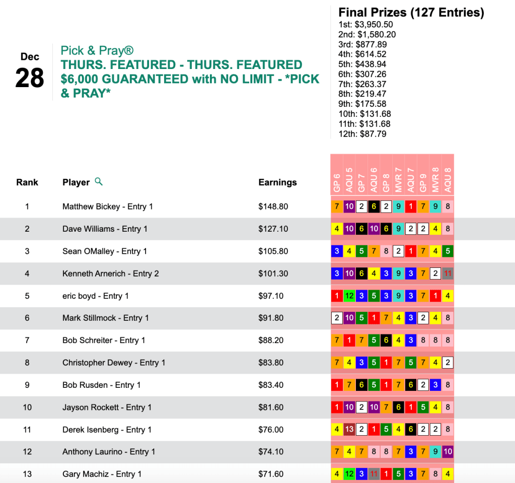 After the first half of Thursday’s $6,000 Gtd. Pick & Pray, Matthew Bickey’s score was a nice round number, but he heated up in a big way during the final five races.