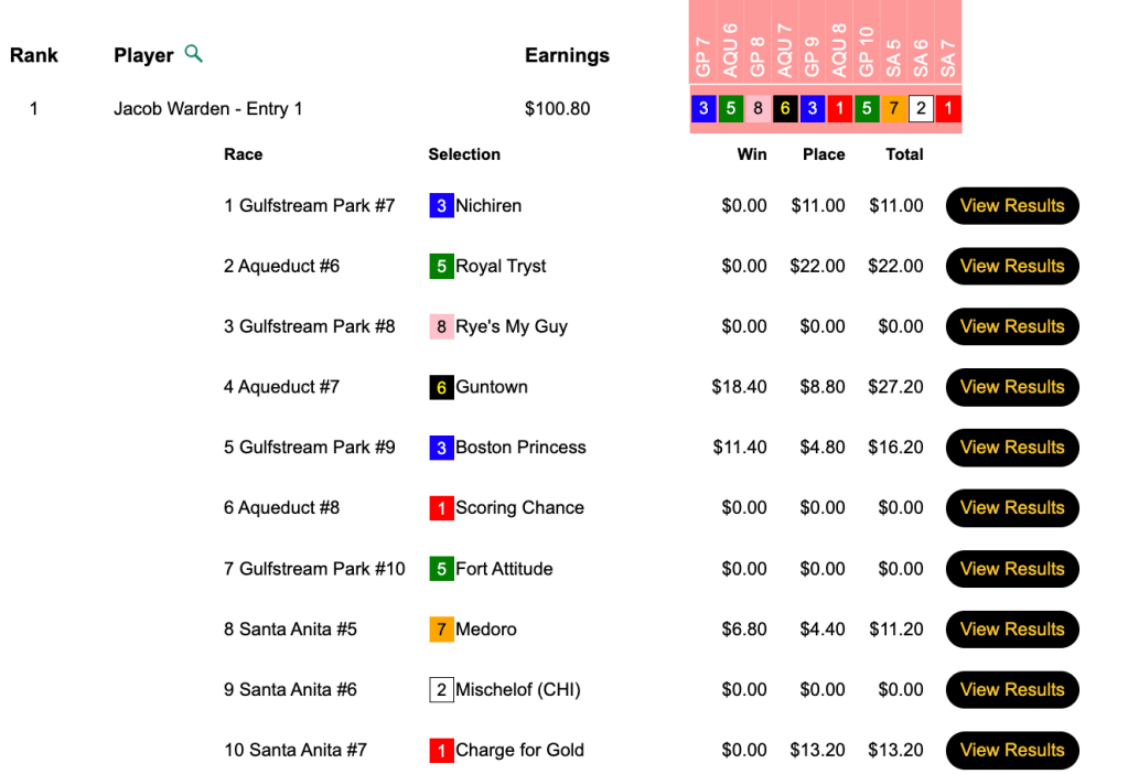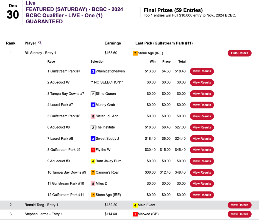 NHC Hall of Famer Trey Stiles led the way with $111.80, but he is already double-qualified and was playing for NHC Tour points. The two March 2024 seats went to Tony Brice (4 wins, 2 places) and Rich Averill (5W, 1P). Both of Brice’s place collections played like winners, as they returned $22.00 and $13.20. Averill, meanwhile, shot out of the gate like R Harper Rose, firing off winners in the each of the first 5 races…and all five paid double-digits.