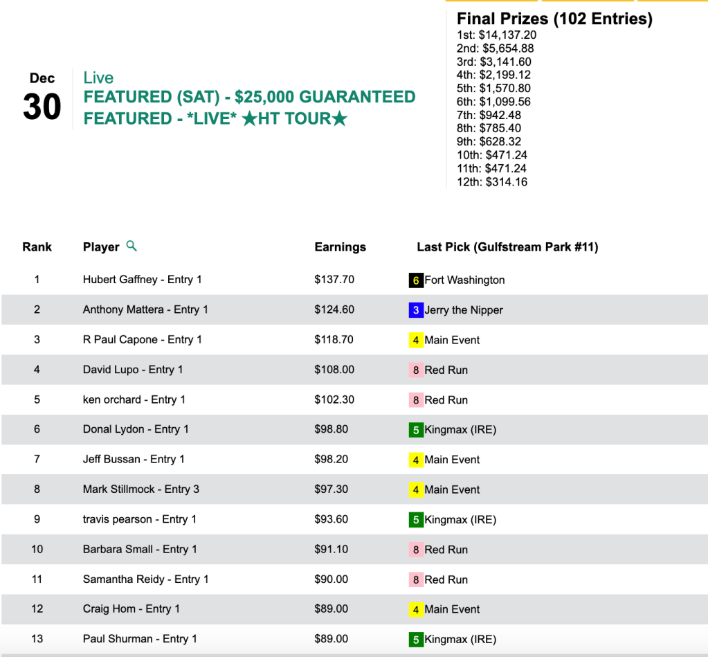 Five winners—topped by Cannon’s Roar ($36.00, $12.40) in the 9th at Tampa—plus two place collections got Gaffney the top prize in Saturday’s HT Tour event, our Live-format $25,000 Guaranteed cash tourney. Gaffney bagged $14,137 from what was a final purse of $31,416.