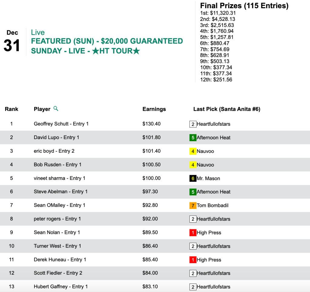 Schutt connected in the final contest race with Heartfullofstars ($33.00, $8.60) in the 6th at Santa Anita and that propelled him to an end-of-year payday of $11,320 in a $20,000 Guaranteed cash tourney that ultimately was worth a total of $25,156.