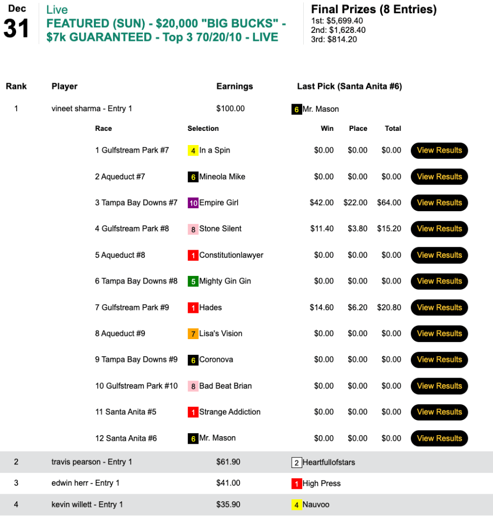 We mentioned earlier that Vineet Sharma was one of those who earned a Flo-Cal Faceoff seat on Sunday for finishing behind Matthew Bickey. Well…Sharma’s same score of $100.00 on the nose allowed him to rule the roost in Sunday’s $7,000 Gtd. Big Bucks game, which finished with a purse of $8,142.