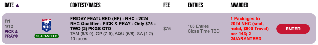 The first NHC First Chance/Last Chance play-in was on Wednesday, so Friday’s qualifier is not quite the first to it. What IS a very-first qualifying offering on Friday is that for the Tampa Bay Downs First Chance/Final Opportunity Contest. This two-day tournament on Feb. 16-17 carries a $1,000 entry fee if you buy your way in. You can get an entry to it for $80, though, in Friday’s 1-per-20 qualifier. As of now, Friday is the only day in which a Tampa qualifier is scheduled, but don’t be surprised to see another one or two popped into the schedule later on.