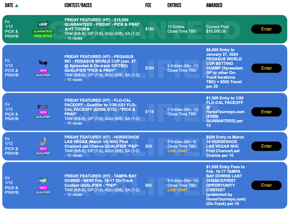 Also featured on Friday, Saturday and Sunday are play-ins to the Jan. 27 Pegasus World Cup Betting Championship. One of every 20 entrants, at $384 per entry, will get a $6,000 entry plus $500 for travel (though players may also opt to play the Pegasus at Xpressbet).