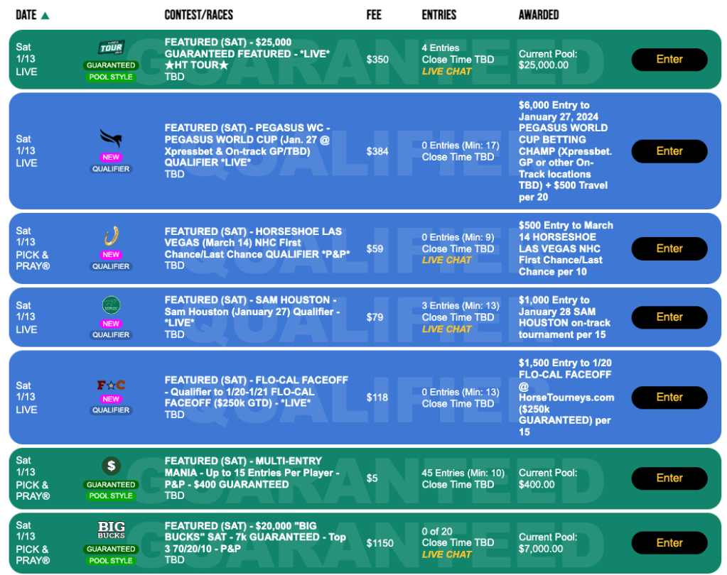 A play-in that you will definitely find offered on each day of the weekend is one for the $250,000 Gtd. Flo-Cal Faceoff on Jan. 20-21. That makes this weekend the final weekend in which to qualify for the first leg of the new 2024 HorseTourneys Grand Slam. The Flo-Cal qualifiers cost $118 to play and are 1-per-15 affairs with the objective being a $1,500 entry.