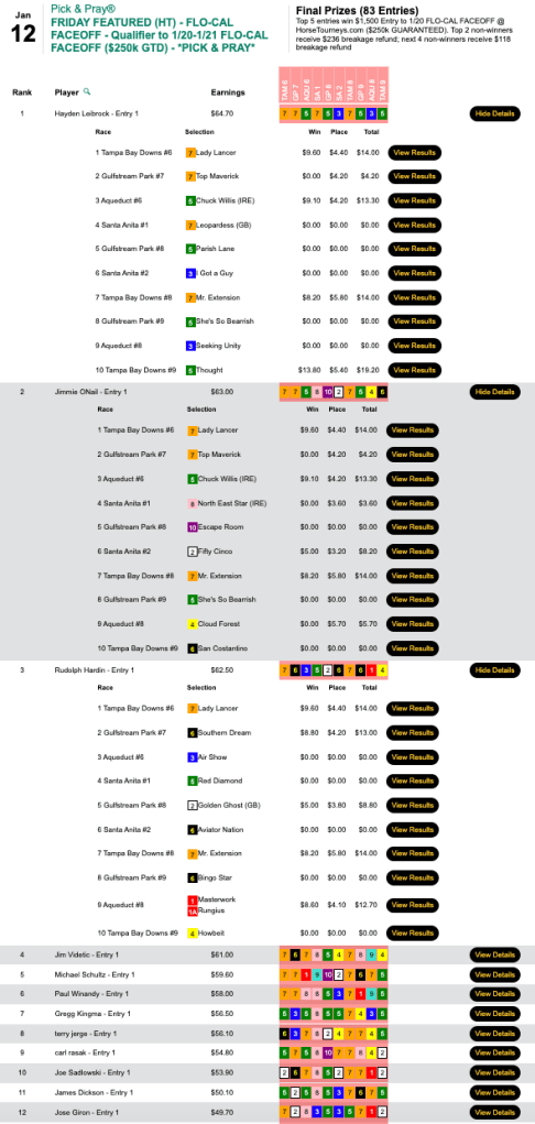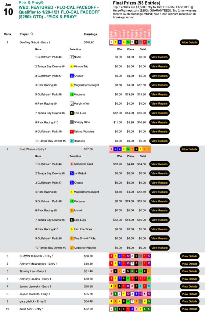 The first-place finisher in Wednesday’s Flo-Cal qualifier, Schutt used the same selections in this Live-format, $5,000 Guaranteed game. His 5 collections (3 wins, 2 places) came consecutively in mid-tourney and included Epic Luck ($57.20, $14.00) in the 8th at Tampa. The run led to a payday for Schutt of $3,266 in a game that paid out a total of $7,258.