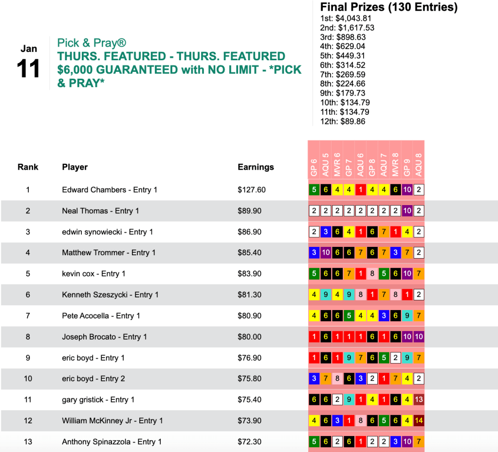 Chambers smoked out Morethanafeeling ($47.20, $21.60) in race 5 at the Big A and Mysaria ($74.00, $28.00) in race 8. That got Chambers the grand prize of $4,043 in Thursday’s $6,000 Gtd. Pick & Pray, which closed with a final purse of $8,986.