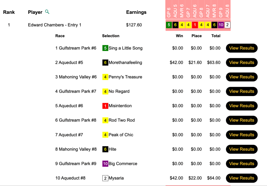 Matties (6 wins, 2 places) and runner up Paul “Morning” Kloeker (1W, 6P) both scored nicely with Eyes Eleven ($24.20, $9.20) in the 9th at Laurel. In fact, Eyes Eleven was Kloeker’s only winner of the day.