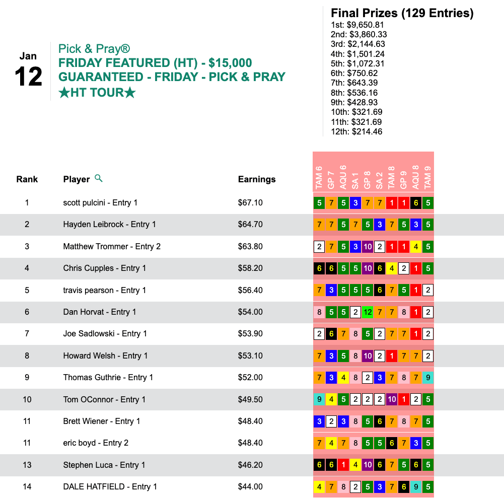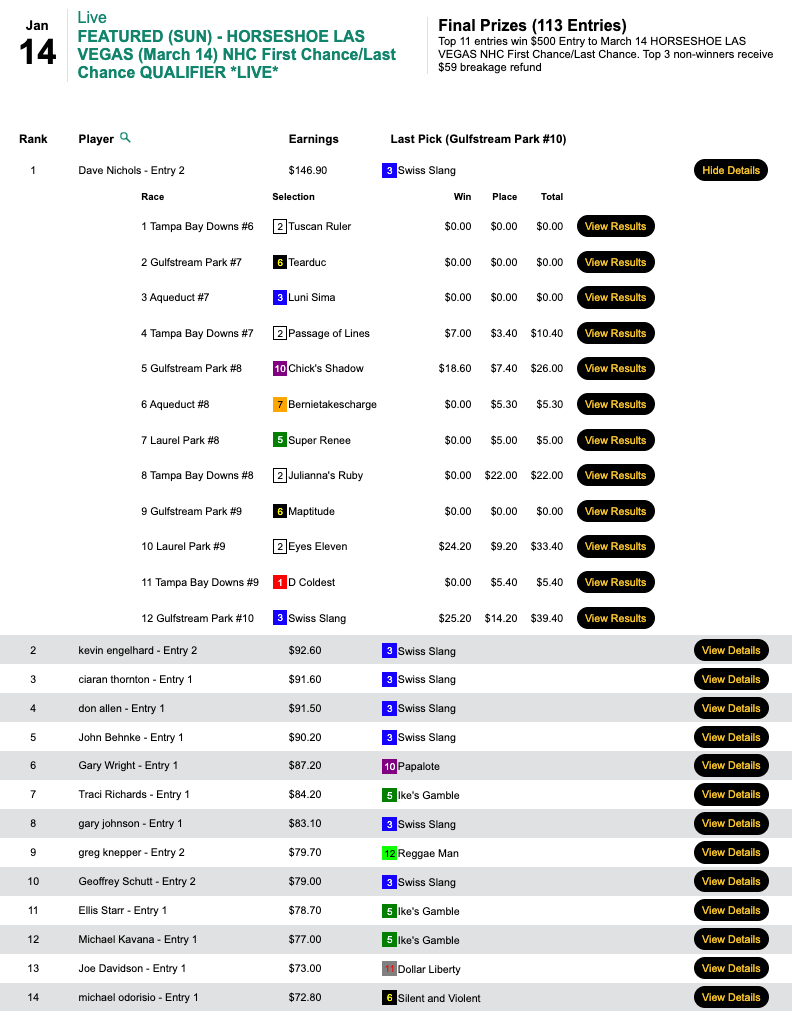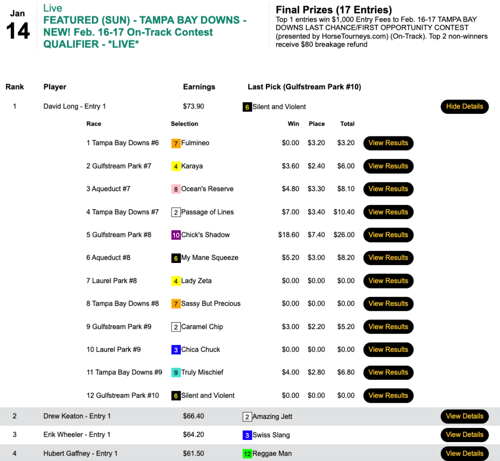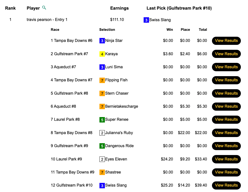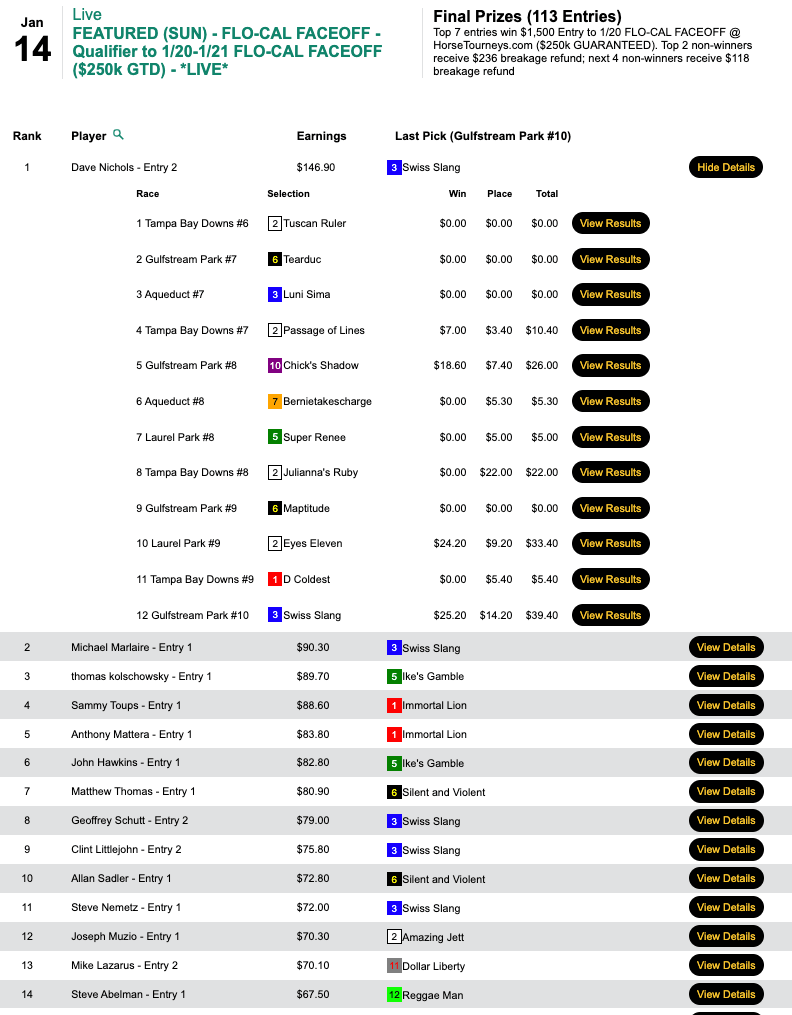 The day’s HT Tour game was our $20,000 Guaranteed tourney, which wound up with a purse of an even $28,000. Pearson got $12,600 of that by picking 3 winners and 3 runners up that included a pair of victorious 11-1 shots late—the somewhat appropriately named Eyes Eleven ($24.20, $9.20) in the 9th at Laurel and Swiss Slang ($25.20, $14.20) in the final contest race, the 11th at Gulfstream.