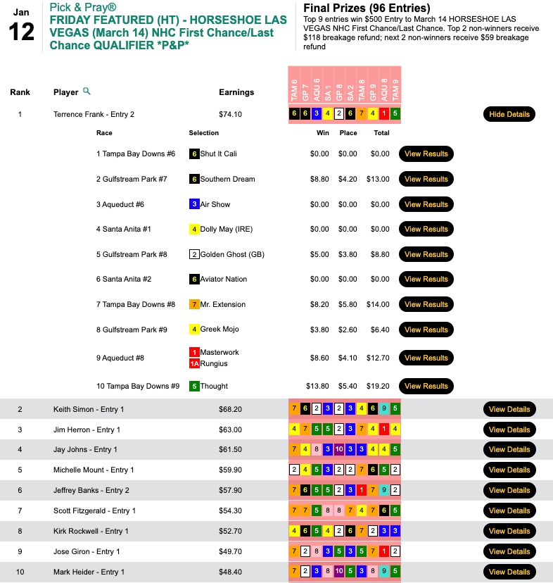 They were the three seat winners in Friday’s $75 NHC qualifier at HorsePlayers.