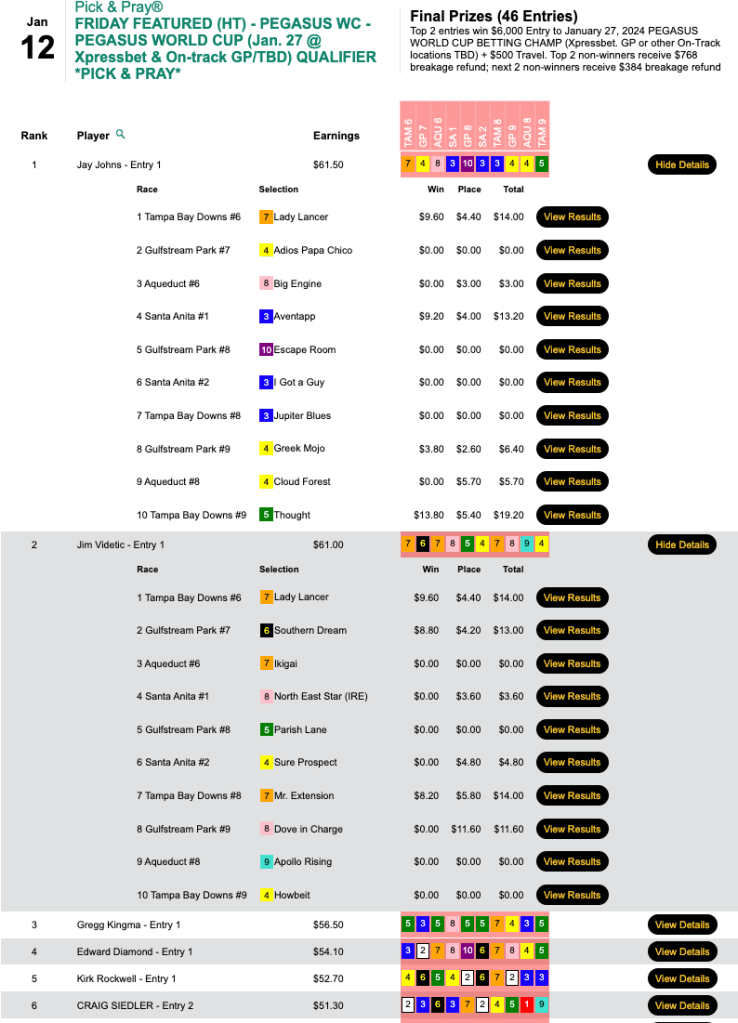 Jay Johns (4 wins, 2 places) and Jim Videtic (3W, 3P) each earned $6,500 Pegasus World Cup Betting Championship packages on Friday.