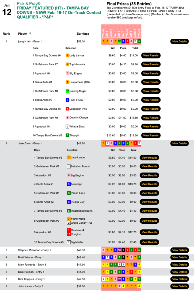 Unlike on Thursday, long prices were in short supply on Friday. In Friday’s HT Tour event, our $15,000 Gtd. Pick & Pray, Scott Pulcini (3 firsts, 2 seconds) got the biggest return of the day in the final contest race with Thought ($13.80, $5.40) in the 9th at Tampa.