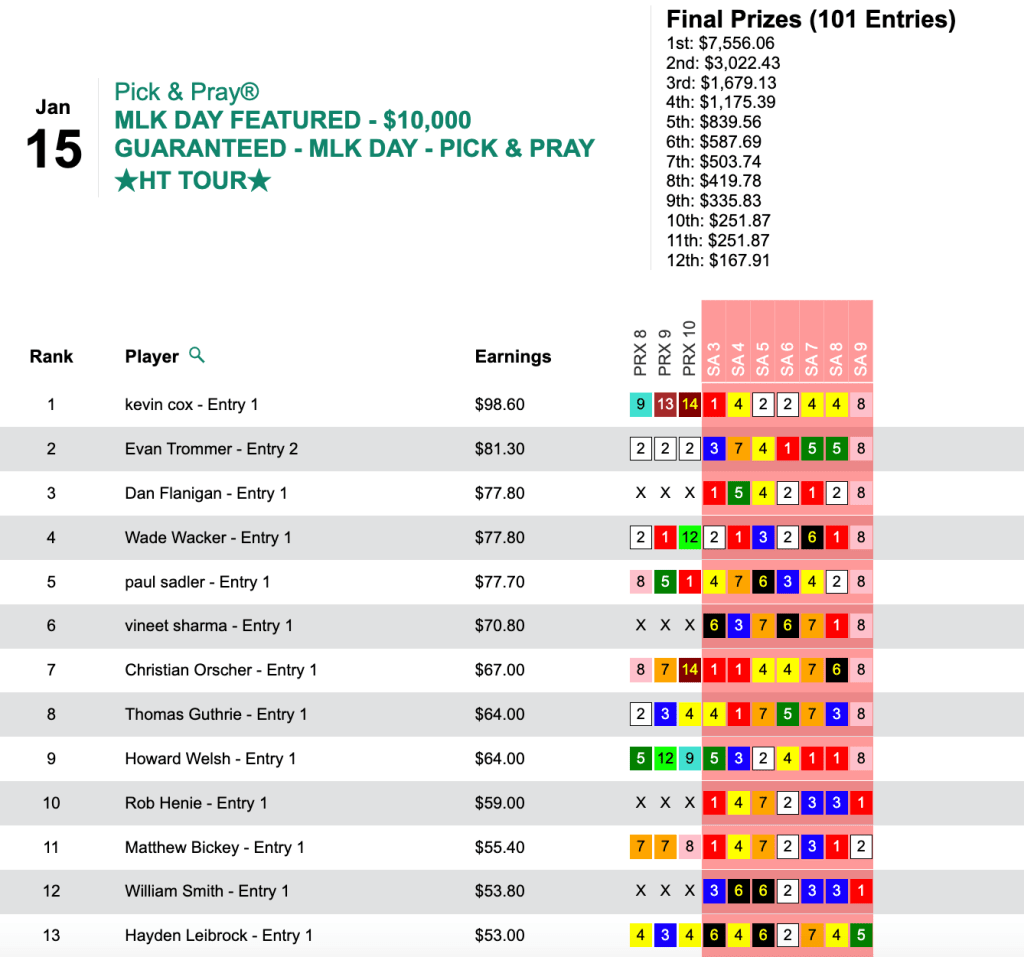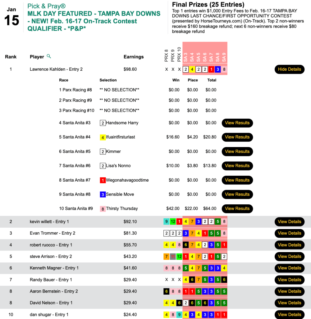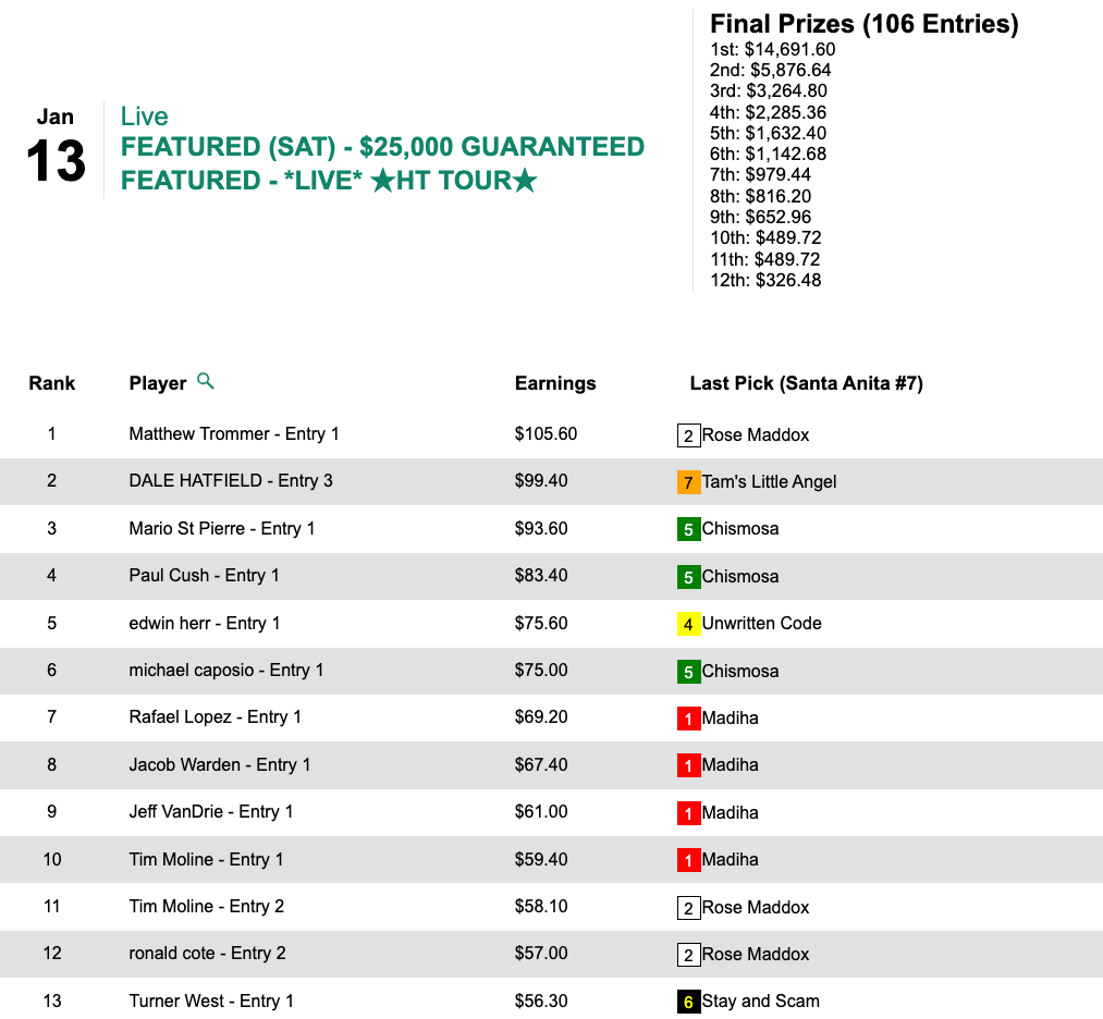 Kevin Cox had it—Thirsty Thursday ($59.80, $24.60) in the 9th and final at Santa Anita. It was the third of three Monday winners for Cox, and he got the $7,556 grand prize in Monday’s HT Tour competition, a $10,000 Guaranteed Pick & Pray, which had a final purse of $16,791.