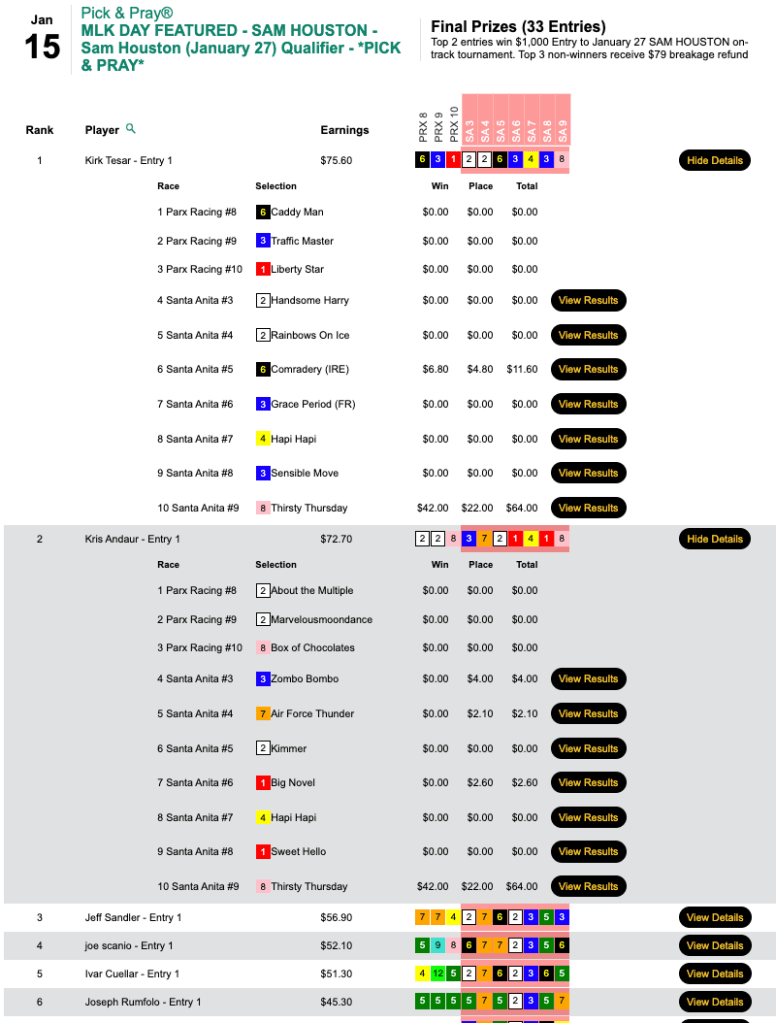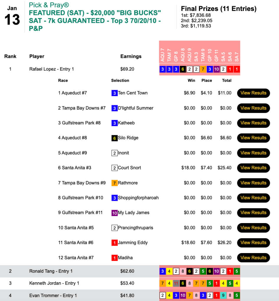 In all, Lopez posted 3 winners and 1 runner up on the way to a triumph worth $7,836 in Saturday’s $7,000 Gtd. Big Bucks Pick & Pray, which closed with a purse of $11,195.