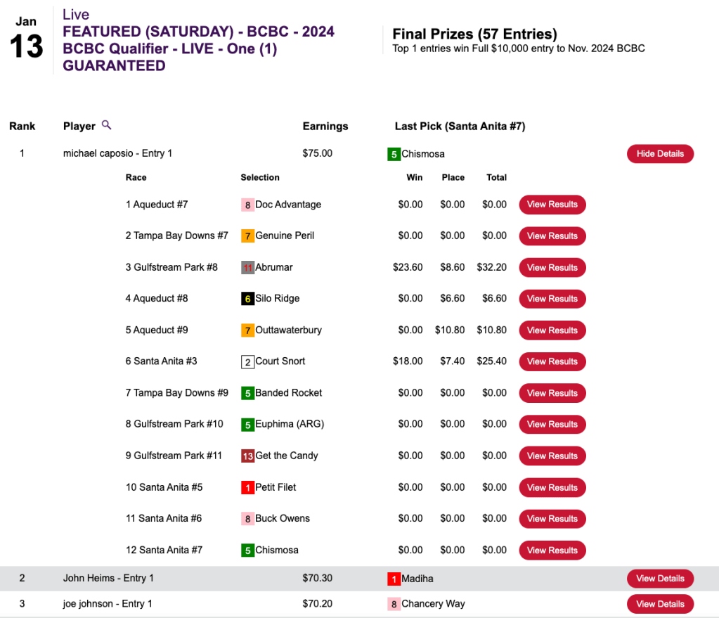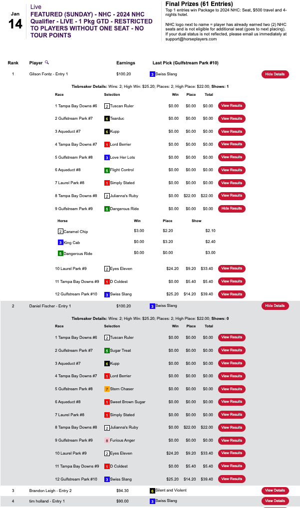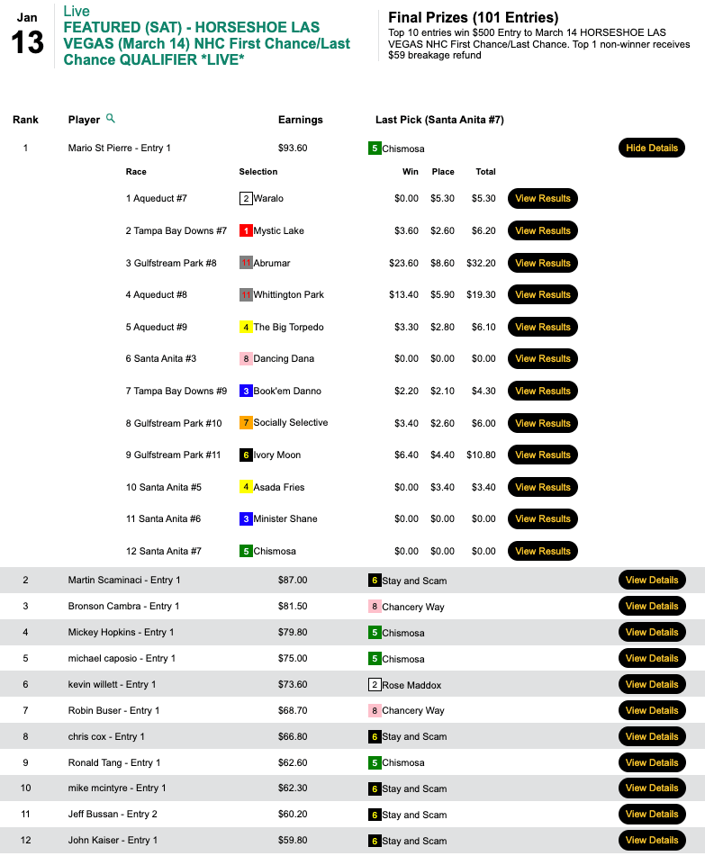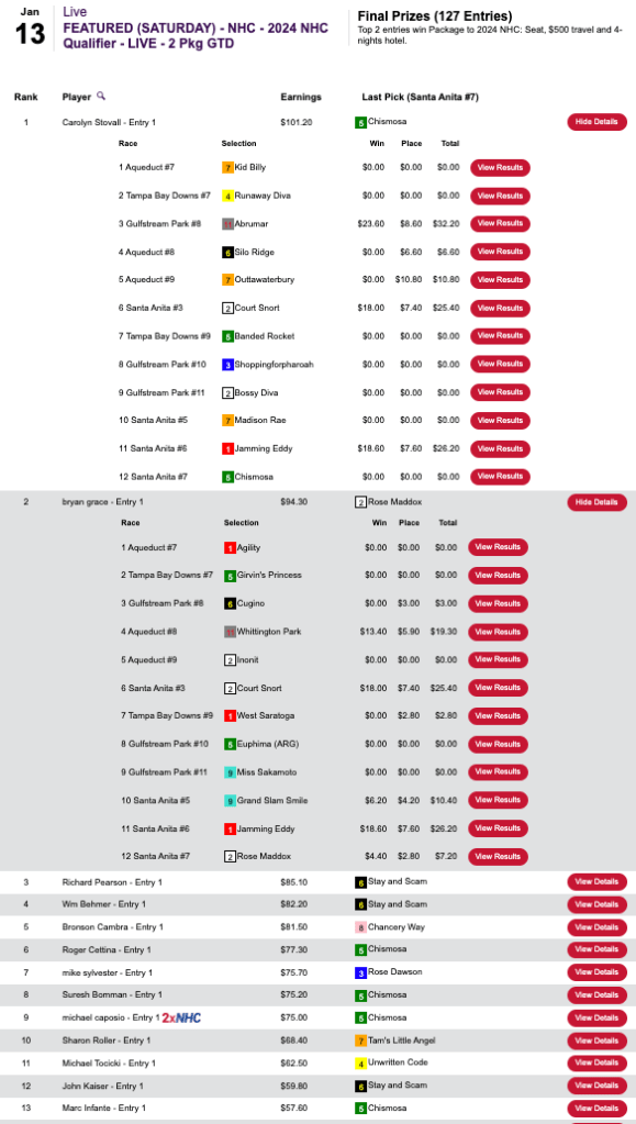 The other Sunday feature at HorsePlayers was a $165 NHC qualifier that was restricted to those who had yet to earn a 2024 seat. It had a rather crazy result that really put the august body of HorseTourneys stewards to the test.