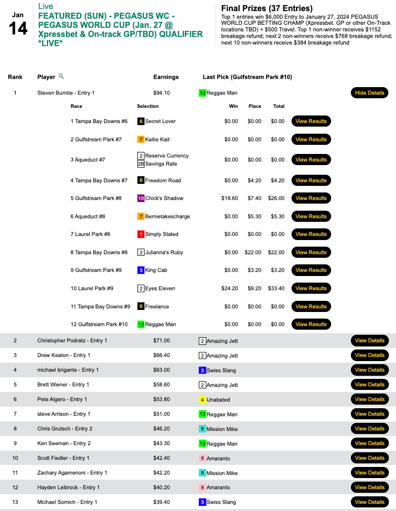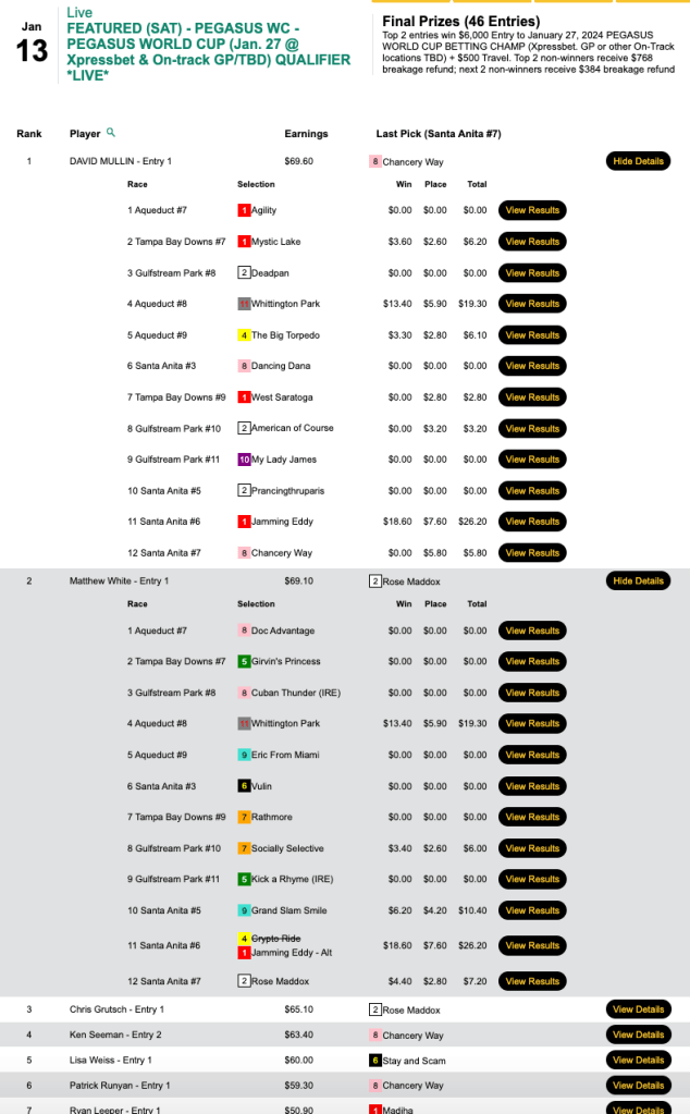 David Mullin (4 wins, 3 places) and Matthew White (5W, 0P) emerged with the coveted $6,500 packages in Saturday’s play-in to the Pegasus World Cup Betting Championship.