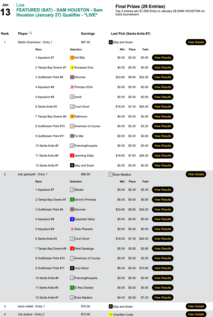Martin Scaminaci (3 wins, 1 places) and Bob Gianquitti (4W, 3P) came away with the $1,000 bankrolls in Saturday’s qualifier to the January 27 Houston Racing Festival Handicapping Contest at Sam Houston.