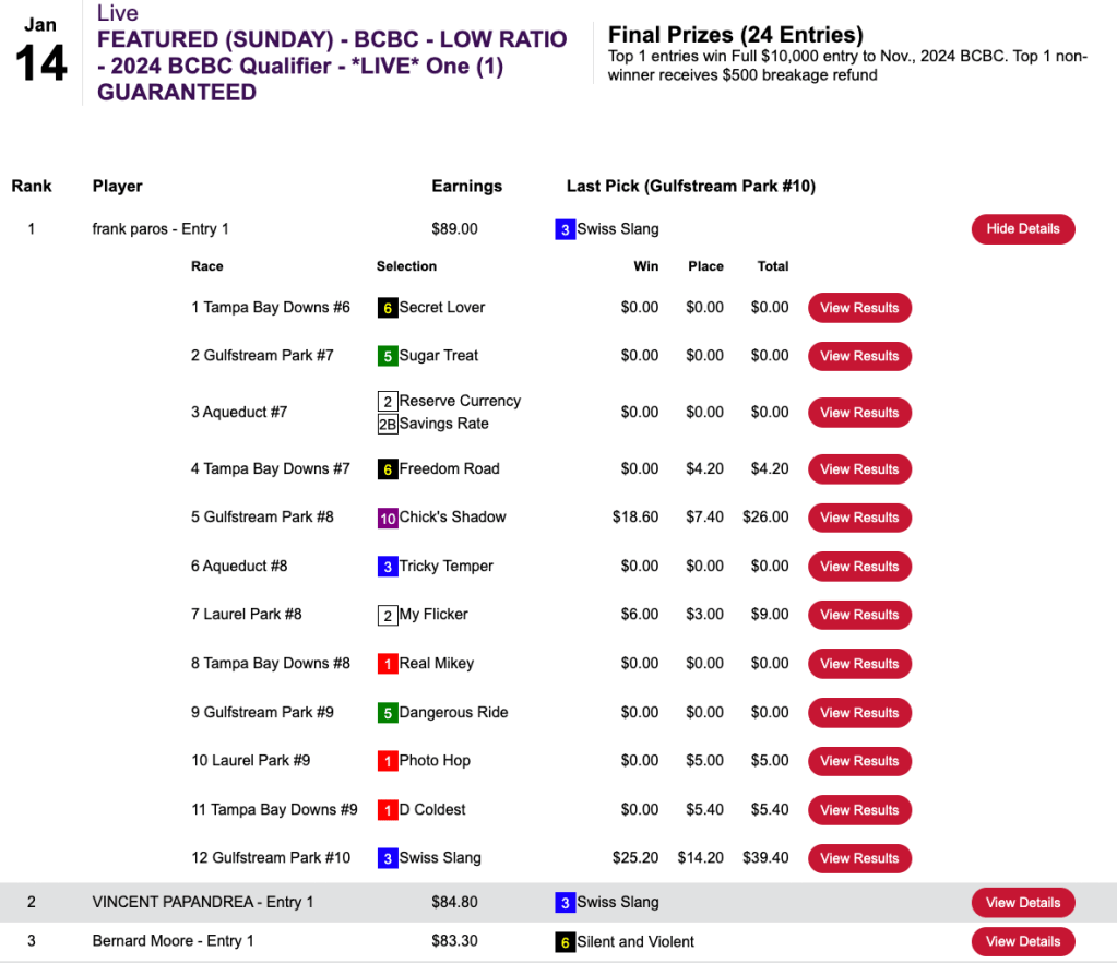 Frank “Plaster of” Paros (3 firsts, 3 seconds) hit Swiss Slang at the end to grab the $10,000 seat in Sunday’s Breeders’ Cup Betting Challenge Low Ratio play-in.