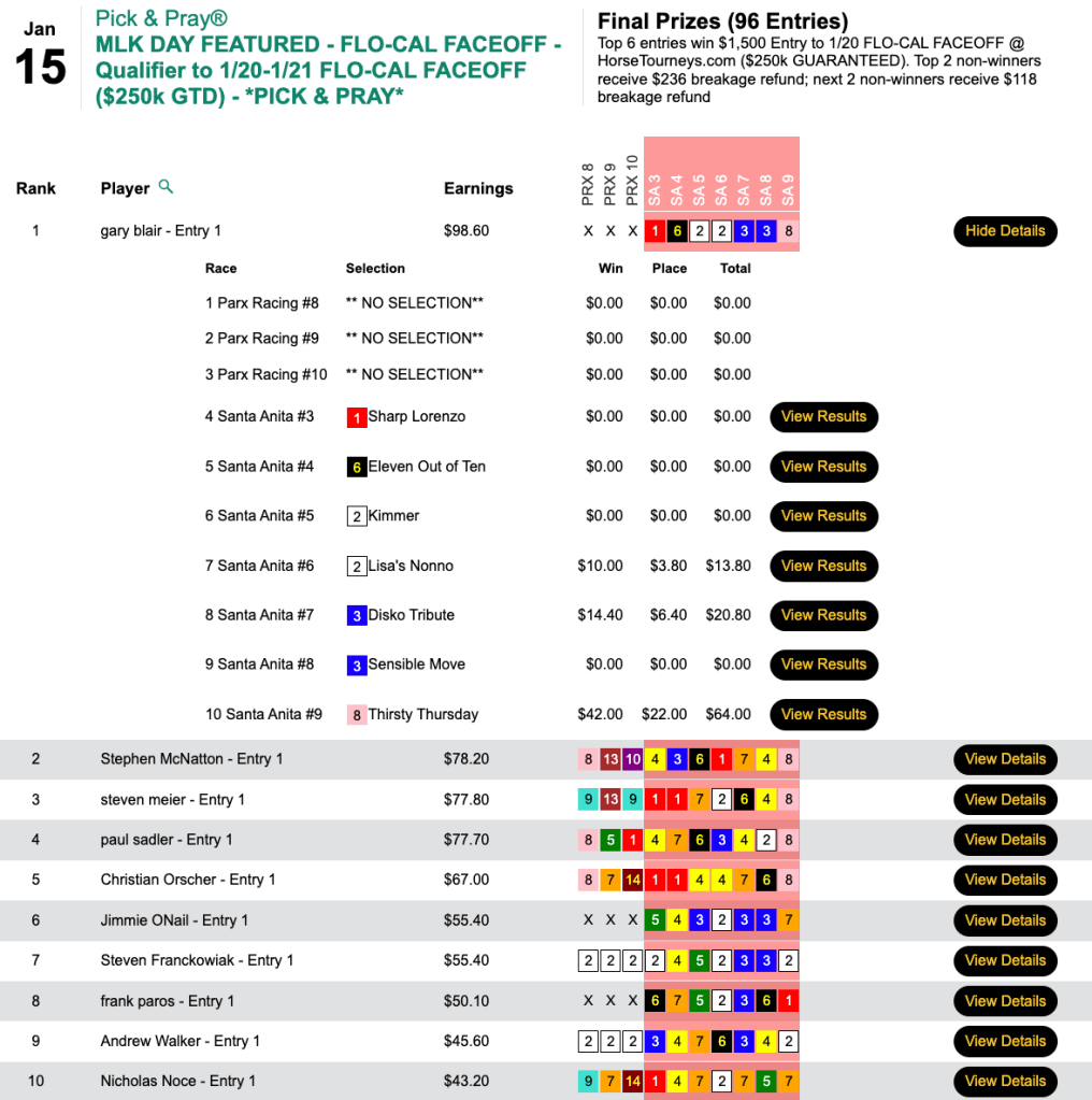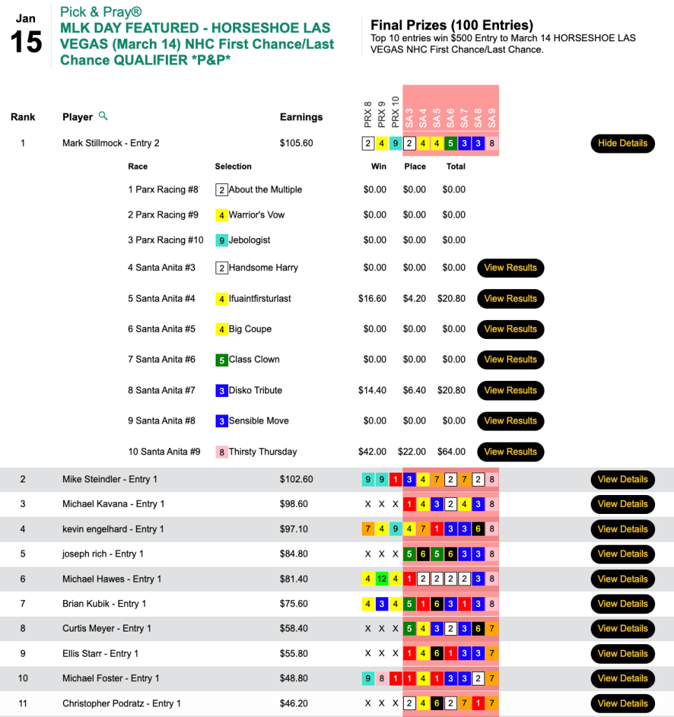 We had six featured events—all at HorseTourneys—on Martin Luther King Jr. Day. What was supposed to be a two-track, 10-race slate became an all-Santa Anita, 7-race schedule due to the Parx cancellation. For the second straight afternoon, the day’s biggest price came in the day’s final race—and this time, it was a capper.