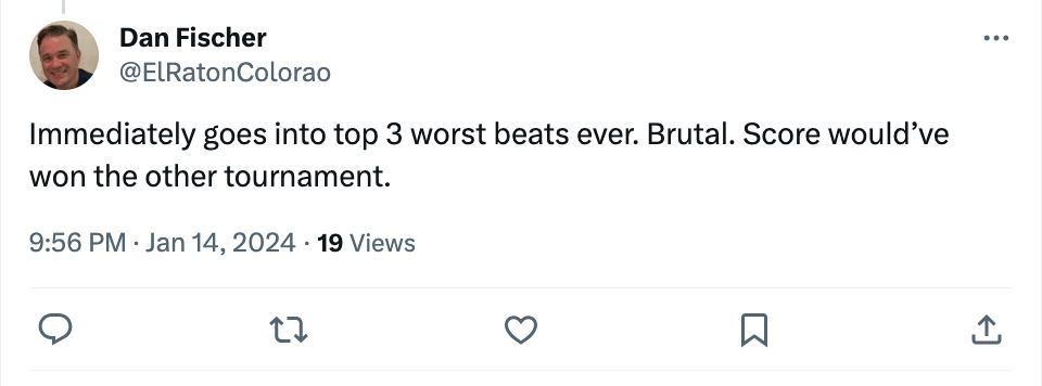 Kudos to Fischer, actually, for keeping it clean. And, for the record, he was referring to the open, $210 NHC qualifier in which the two seat winners had scores of $99.60, and $82.30, respectively.