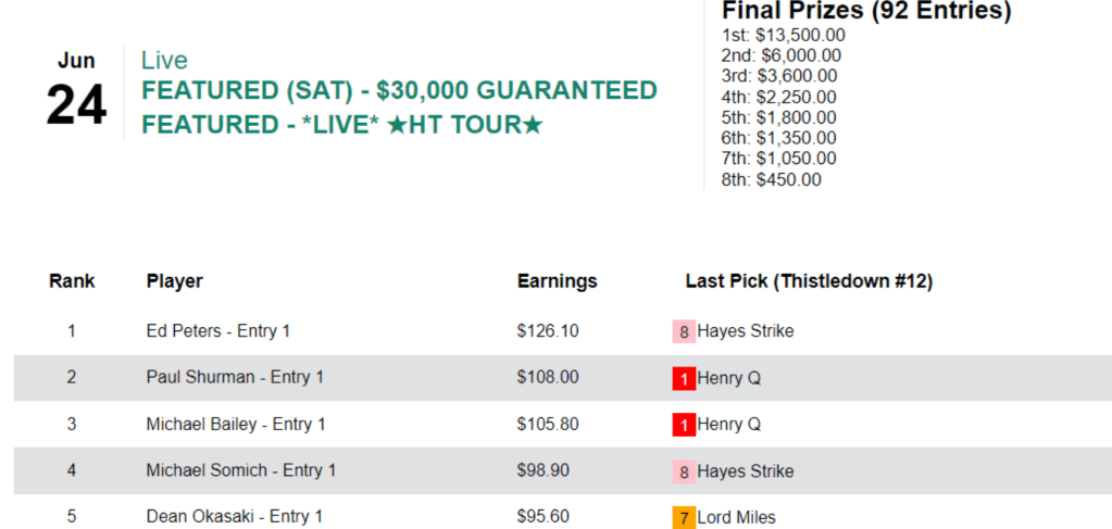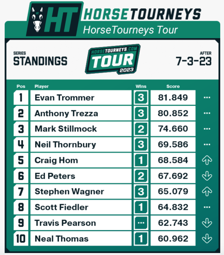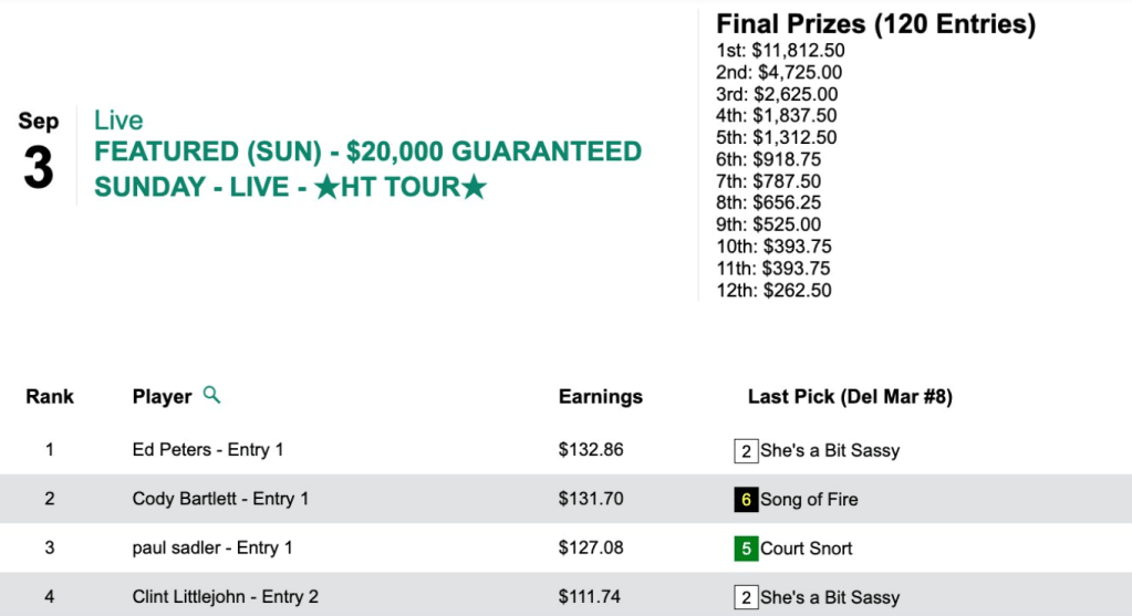 Feeling that he just might be able to see this thing through, Peters stepped up the frequency of his play. He bought into all Friday HT Tour games and all Sunday ones that were Pick & Prays. He continued to only play on Saturdays, though, if he qualified via the Early Birds. By the time the Breeders’ Cup has passed, Peters had relinquished his lead to the always-active Evan Trommer.