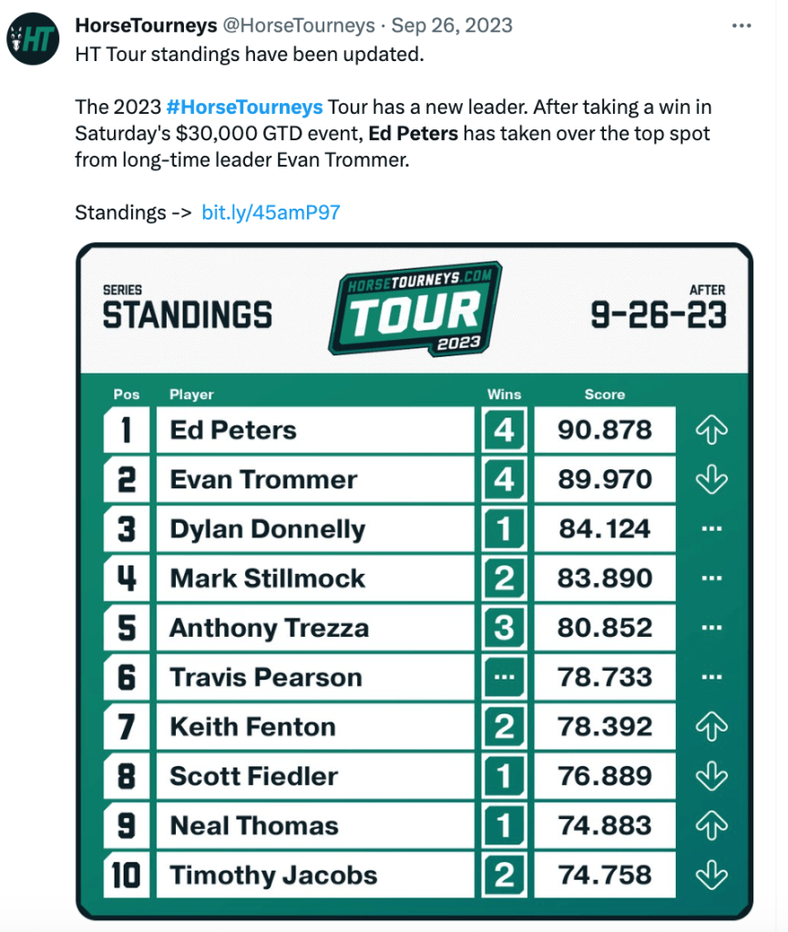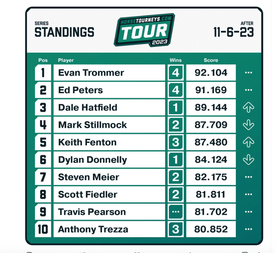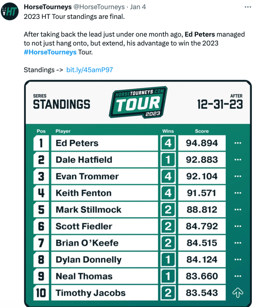 Such a routine may not seem conducive to success in a year-long tourney grind that involves a whole lot of Sundays, but somehow Peters made it work, and when the flour had settled, he was the 2023 HorseTourneys Tour champion, earning a bonus of $26,600. It was something that Peters certainly didn’t envision at the start of the year.