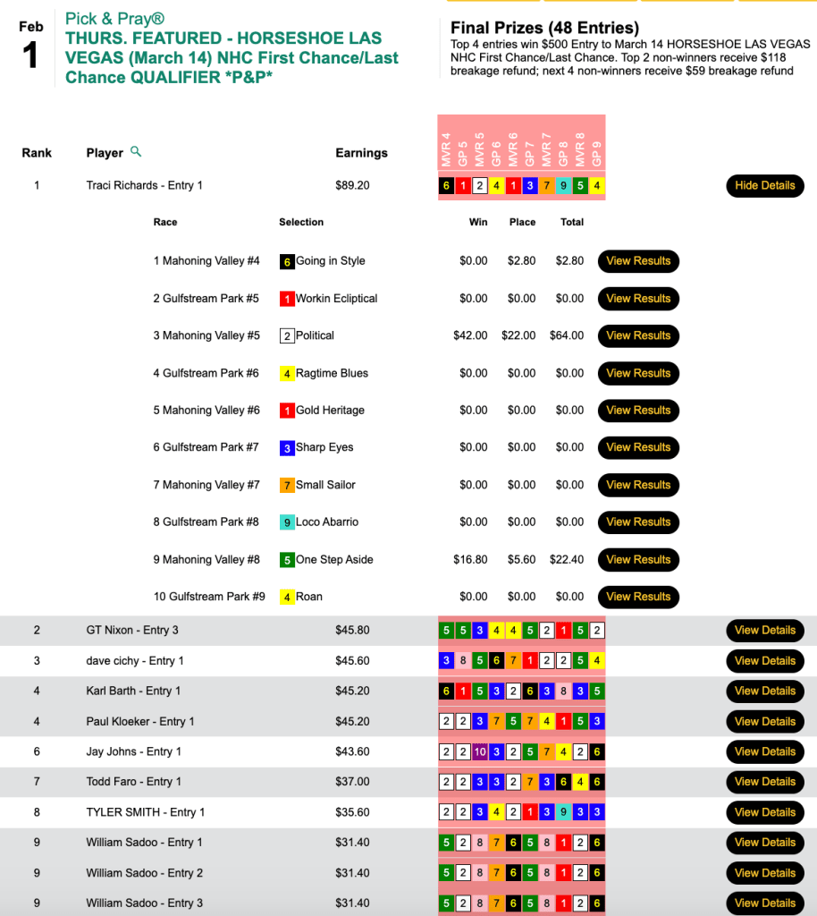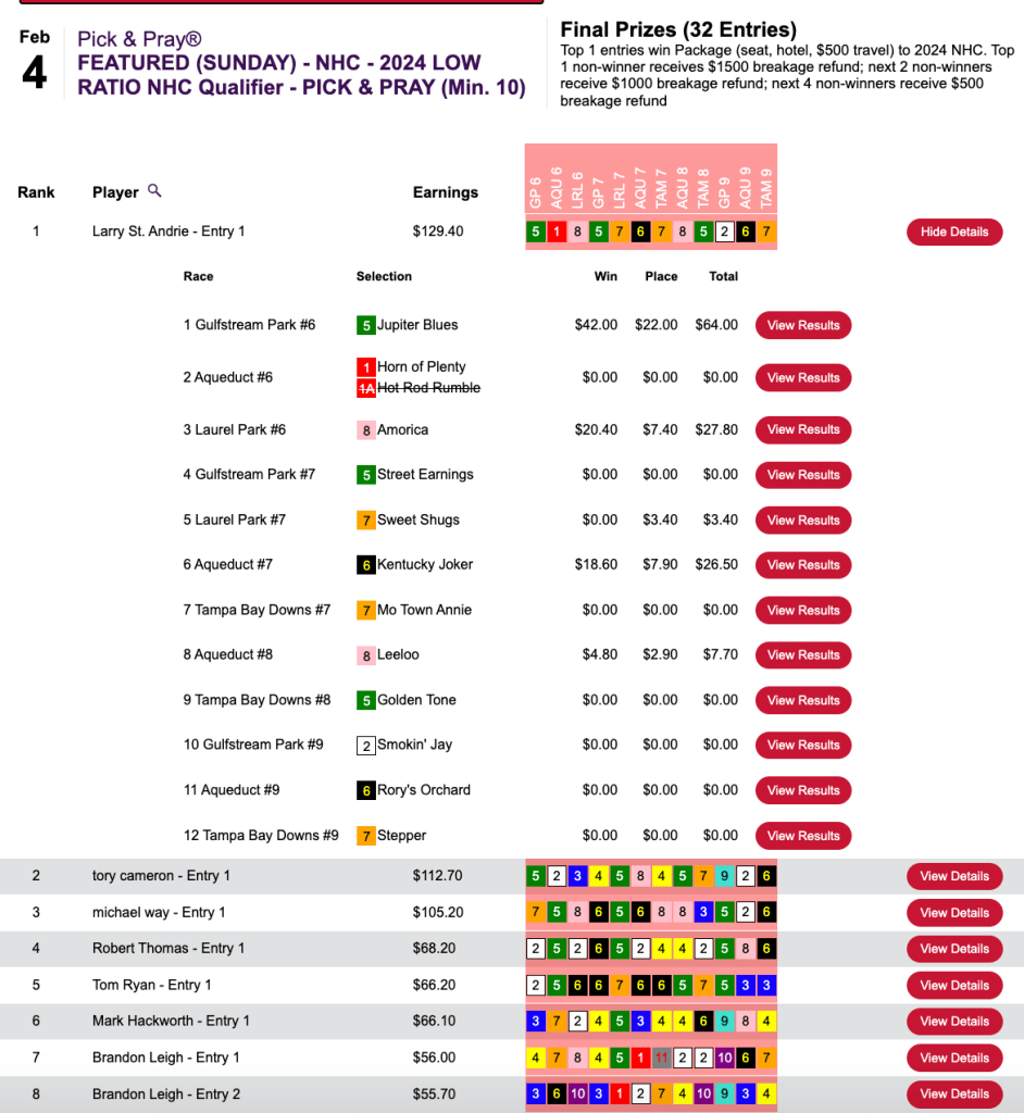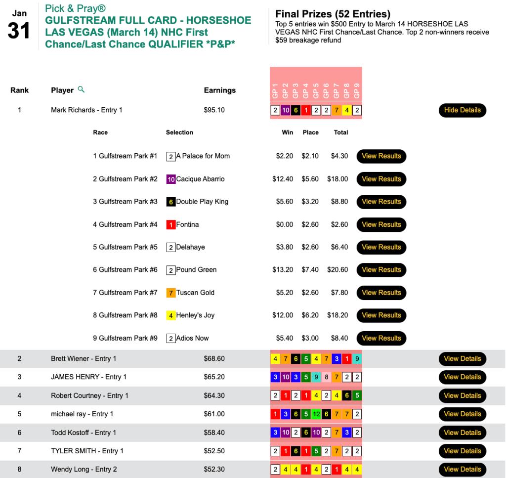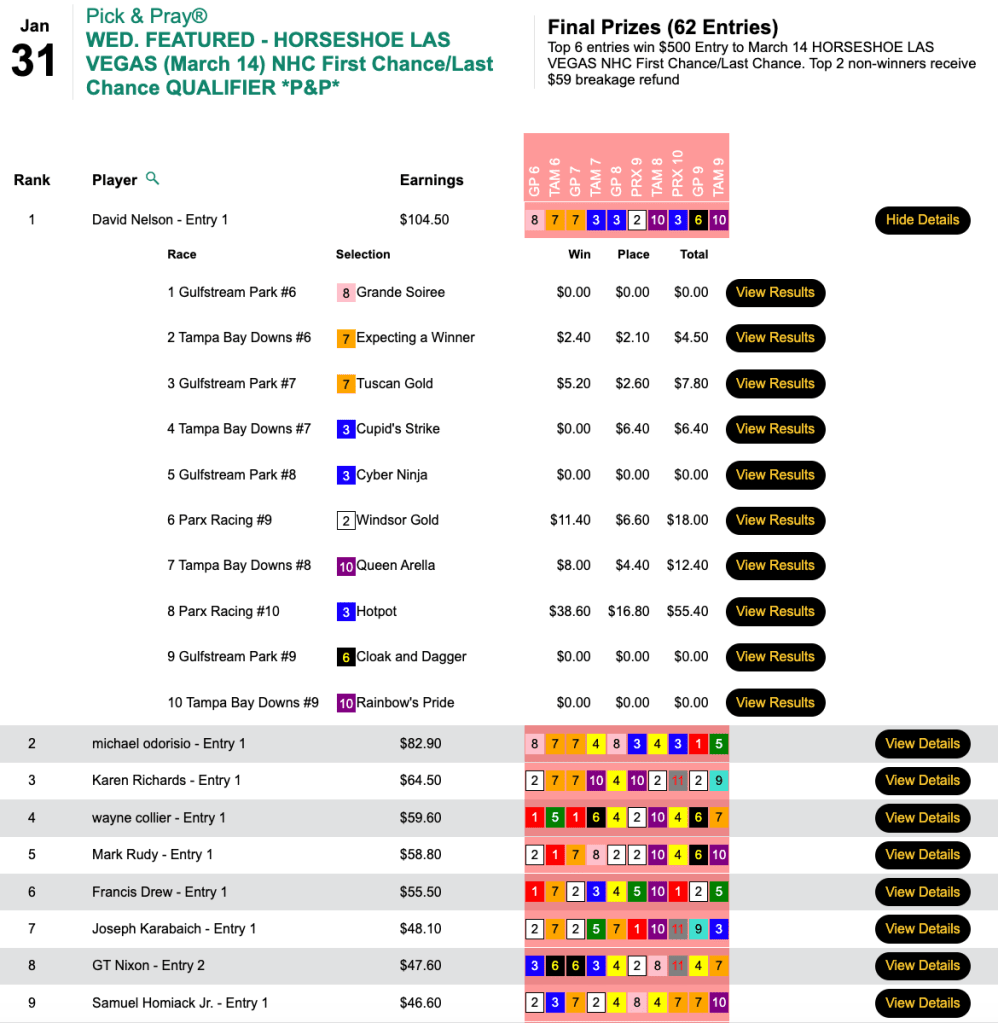 Magnetti and Leight made that early lead hold up and they each punched their tickets to Vegas in this $165 NHC Pick & Pray here at HorseTourneys.