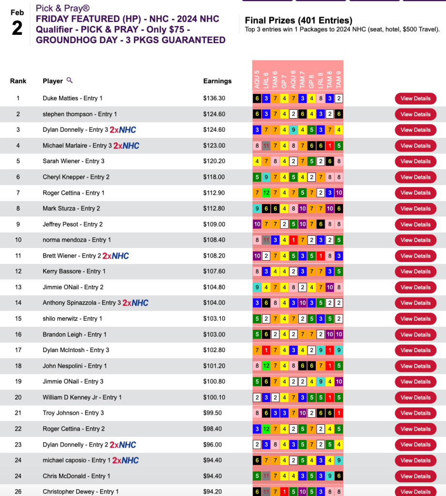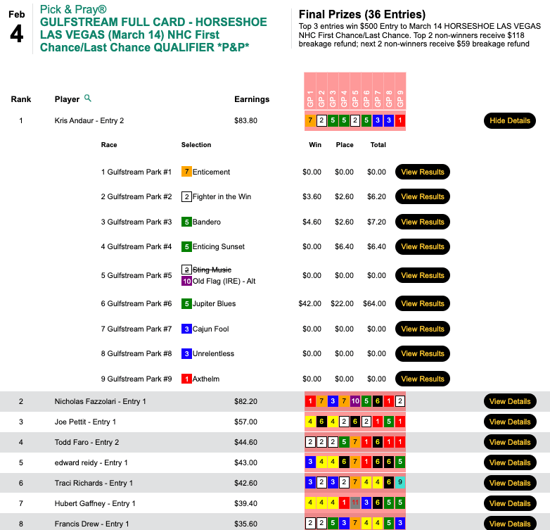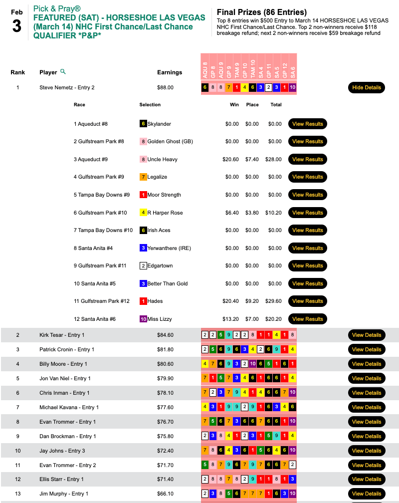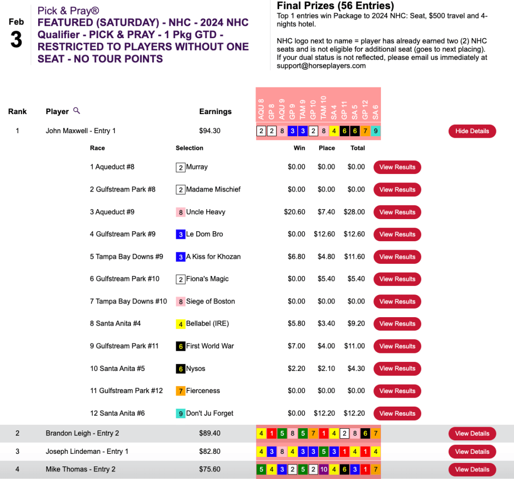 Magnetti and Leight made that early lead hold up and they each punched their tickets to Vegas in this $165 NHC Pick & Pray here at HorseTourneys.