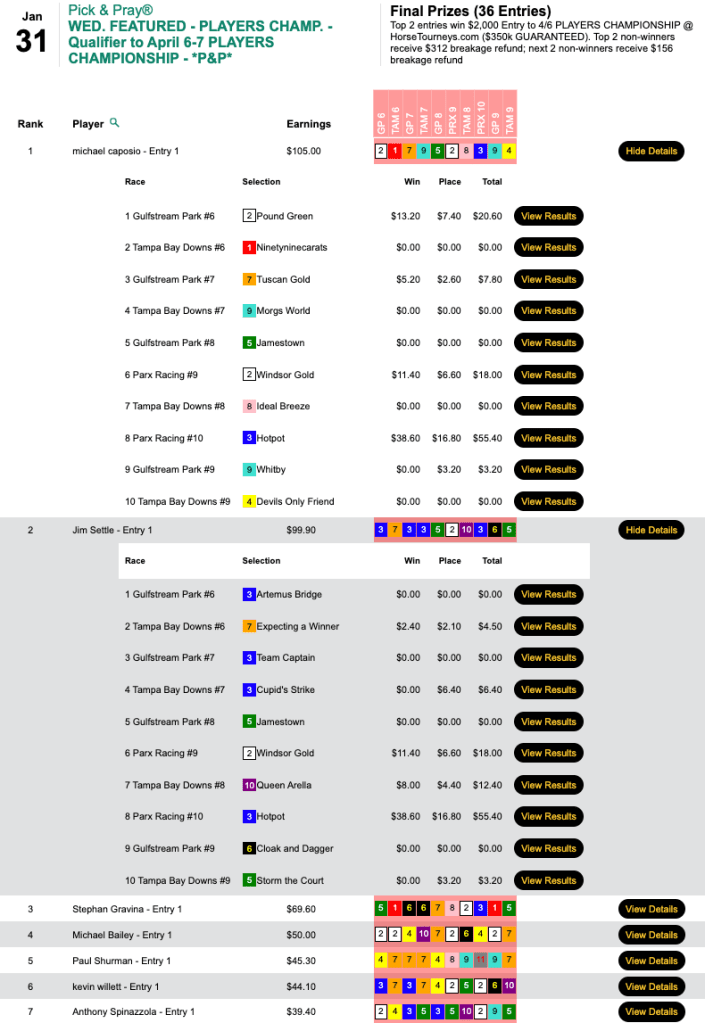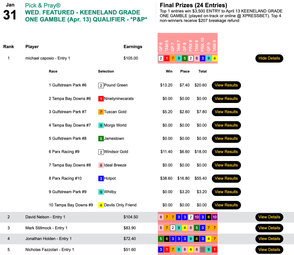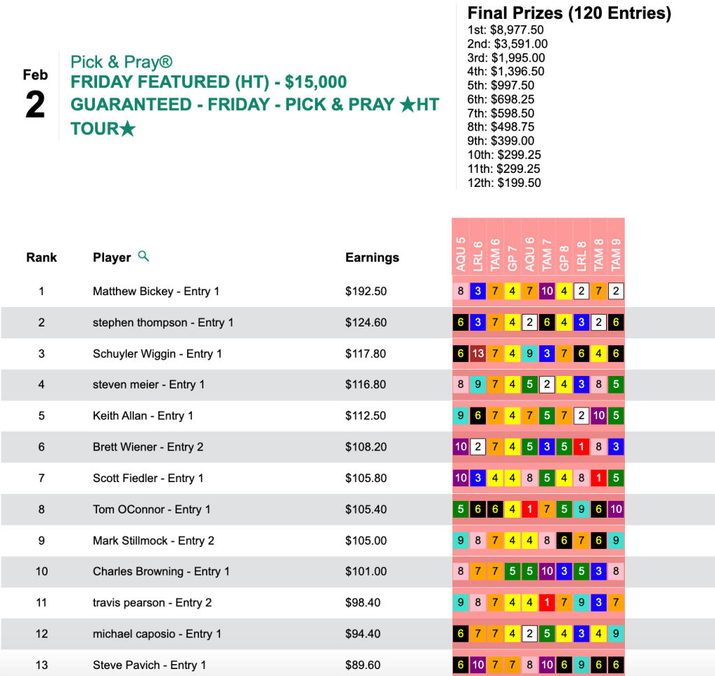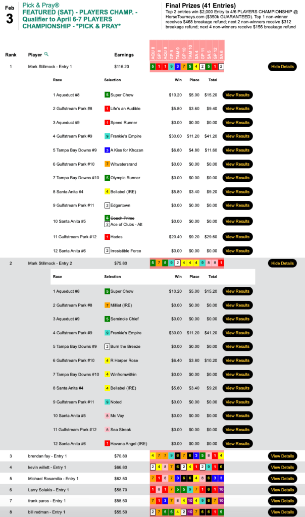 Unlike Wednesday’s Keeneland and Players Championship qualifiers, the cash feature (which closed with a purse of $7,258) was a Live-format game. As is often the case with Caposio, however, he played his Live entry as though it were a Pick & Pray. Over the years, this has worked well for him. In fact, a few years ago he won a bunch of Live-format tourneys on Super Bowl Sunday, having put all of his selections in ahead of time—because he was attending the Super Bowl. So perhaps more good things are in store for him this coming Sunday.