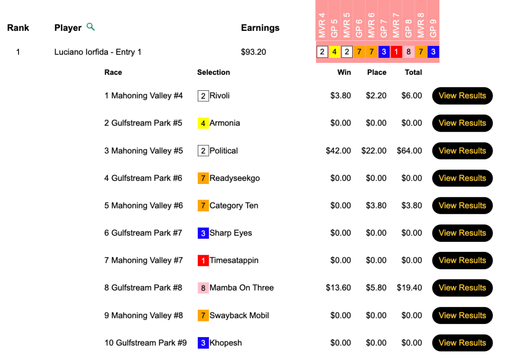 Luciano Iorfida counted Political among his 3 firsts and 1 second. He earned $3,483 for the triumph.