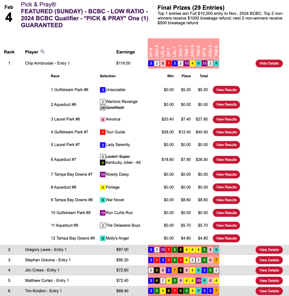 The Sunday Breeders’ Cup Betting Challenge play-in was also a $500 Low Ratio Pick & Pray.