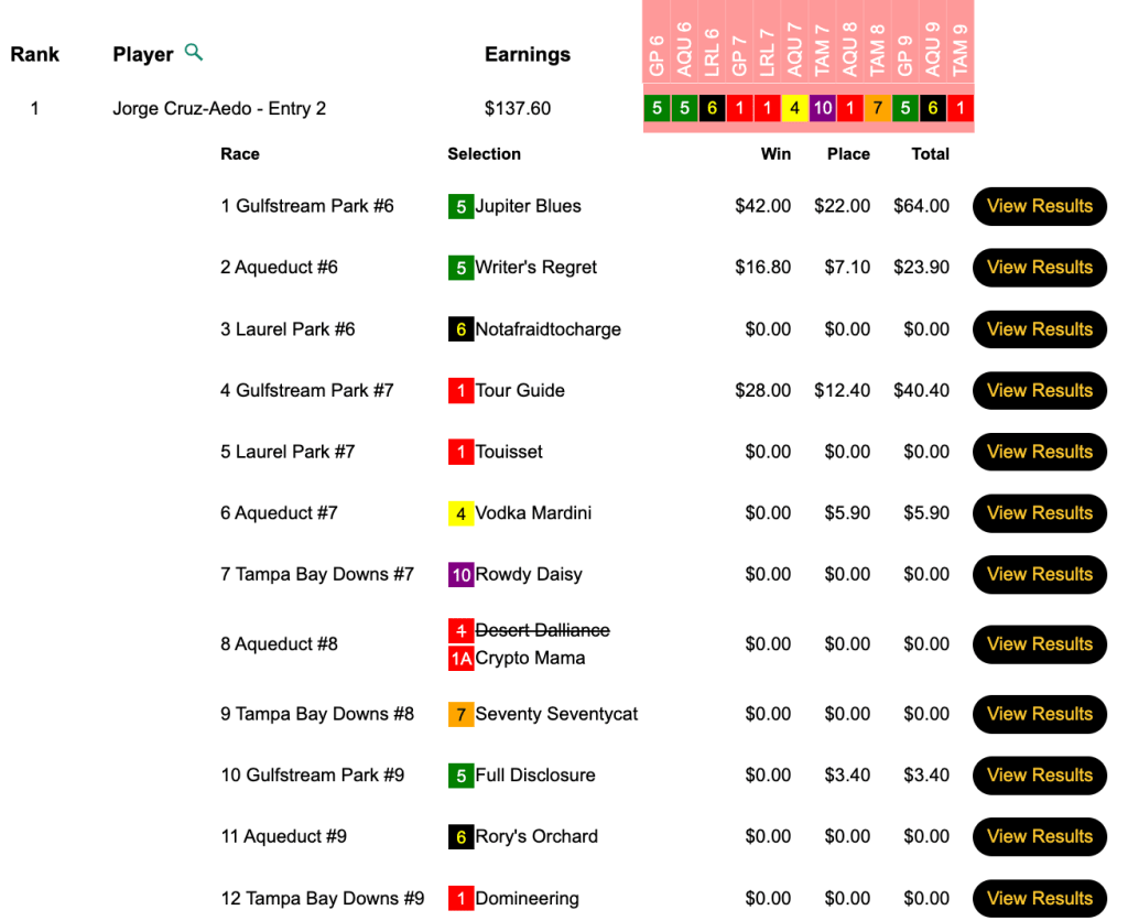 Stillmock had 6 winners on one entry and 4 winners on his “bad” entry. Perhaps most notably, Stillmock used the same horse across both entries in three of the 12 contest races—and all three won! A key for Stillmock was that one of those three “common” horses was Frankie’s Empire ($30.00, $11.20) in the 9th at Gulfstream. That was the highest-paying horse of the day.