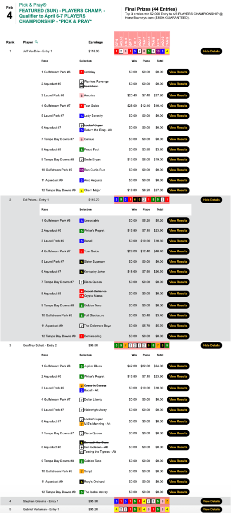 Like Caposio on Wednesday, VanDrie checked in with 4 winners and 1 runner up on his big day. (All of VanDrie’s victors paid double digits in the win hole.) And also like Caposio, two of his victories came in Players Championship and Keeneland Grade One Gamble qualifiers. (Last year’s HT Tour champ Ed Peters and Geoffrey Schutt also got Players Championship spots for finishing closest to VanDrie.)
