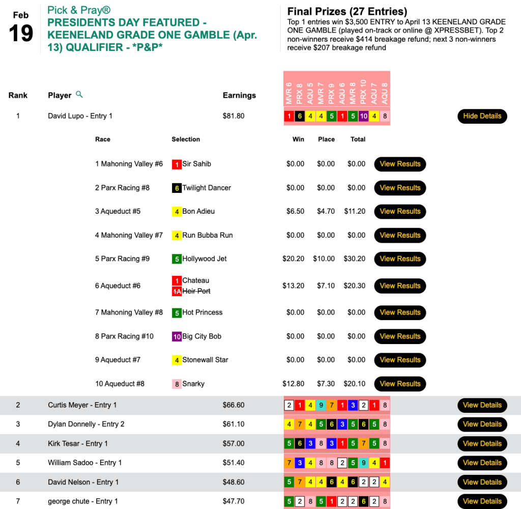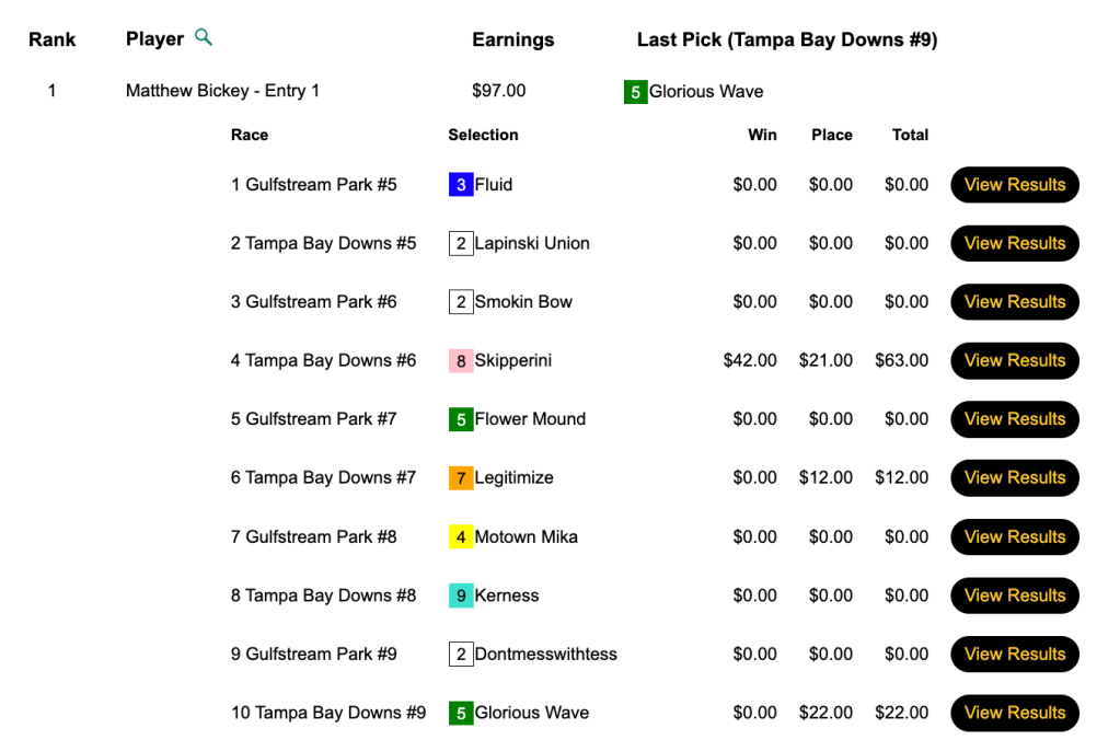 Rockett stockpiled 6 winners and 3 runners up, and he took home the grand prize of $6,411 in Sunday’s $7,000 Gtd. Big Bucks game, which closed with a final prize pool of $9,159. His biggest “winner” was a runner up—Majestic Frontier—who returned $16.20 to place for coming in second in the 7th at Aqueduct.