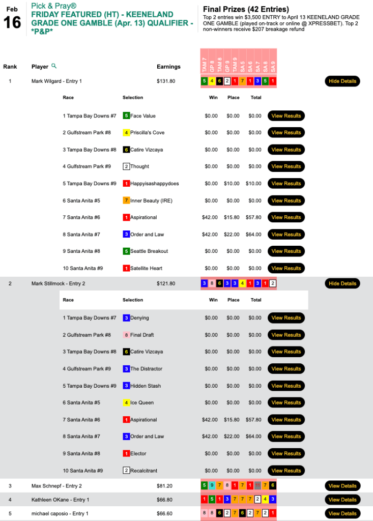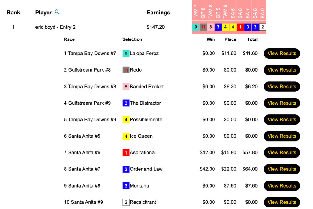 On Friday, the two horses you really wanted to have were Aspirational and Order and Law, who took races 6 and 7, respectively, at the Arcadia, Calif., oval. Coincidentally, they both returned $77.80 in the win hole (though obviously just $42.00 for contest purposes). Eric “B Connected” Boyd had both $77.80 horses plus three runners up.