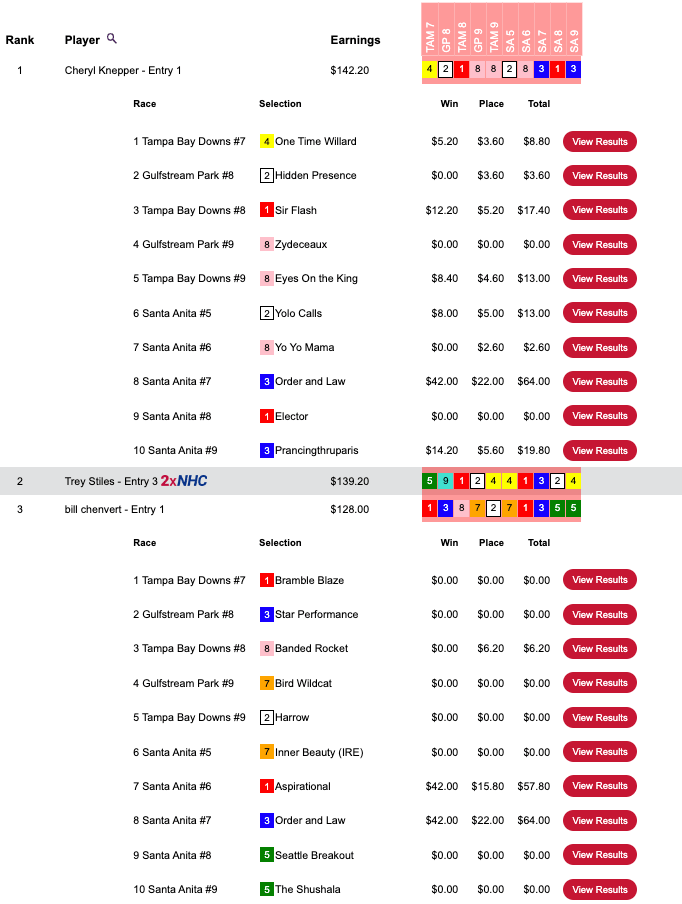 The 2018 Horseplayers World Series champ Bob Montgomery (3 wins, 3 places) and John “The Clocker” Nichols got the $500 spots in the Gulfstream-only version on Wednesday. The best return for both came via Acamar ($21.80, $8.00) in race 4.