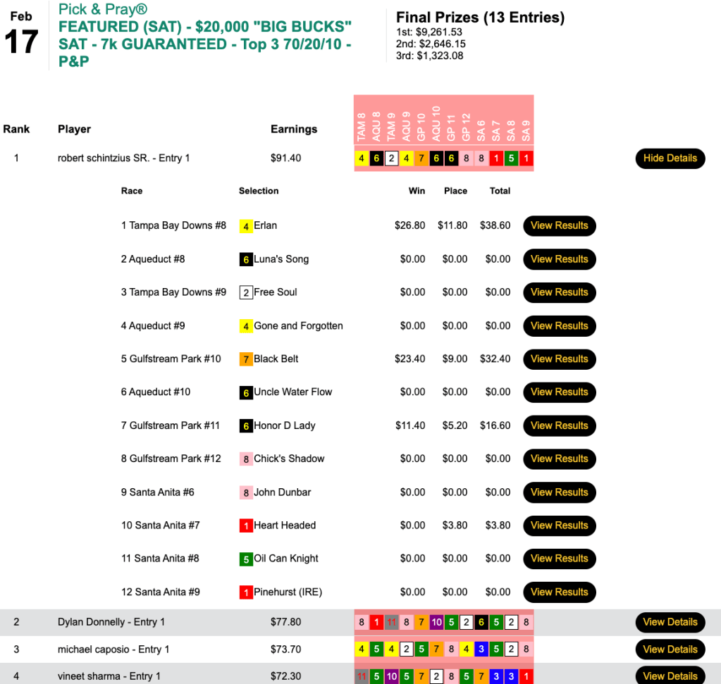 Schintzius pocketed $9,261 in Saturday’s $7,000 Gtd. Big Bucks Pick & Pray, which obviously blew past its guarantee. The total pot in the $1,150-buy-in game came to $13,230.