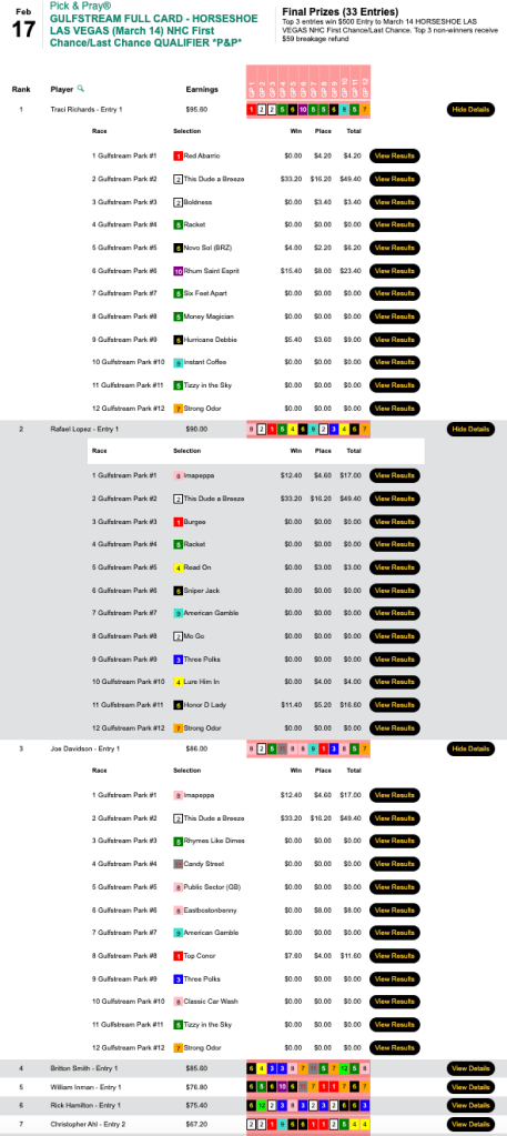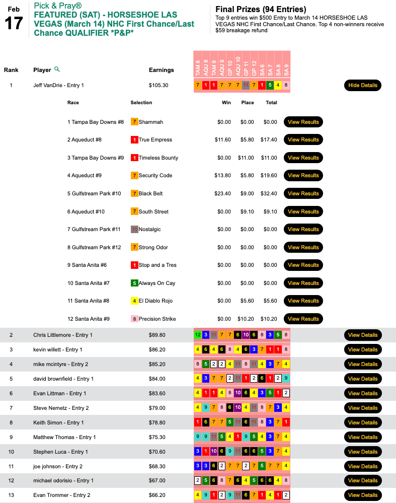 Witt doubled down on his nine selections in Thursday’s Gulfstream-only qualifier to the NHC Last Chance/First Chance, and he wound up taking home both of the available $500 seats.