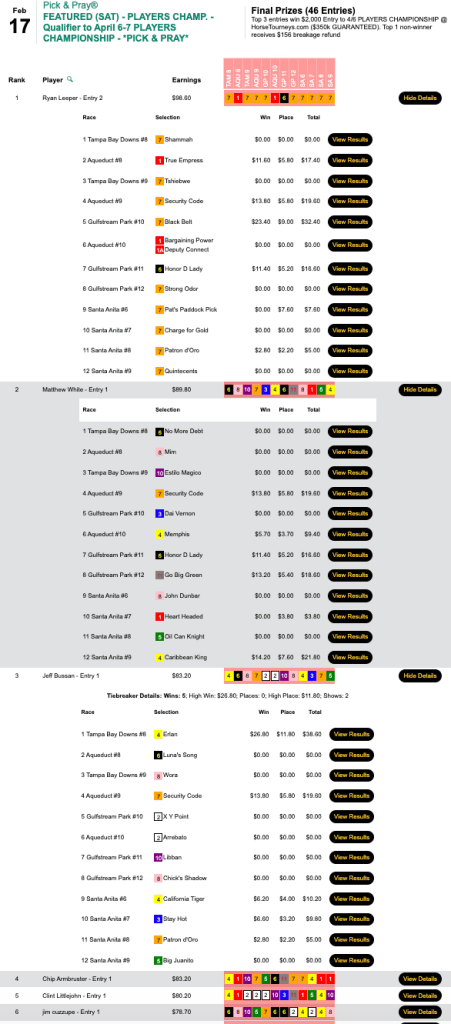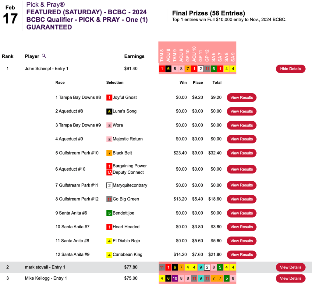 Over at HorsePlayers, the winner of Saturday’s $179 Breeders’ Cup Betting Challenge Pick & Pray was John “Detlef” Schimpf.