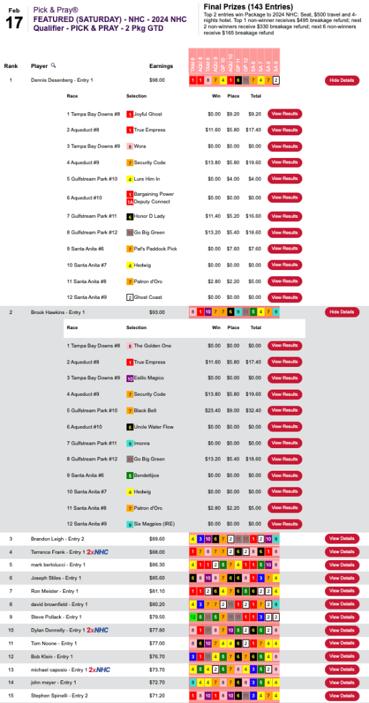Dennis Desenberg (5 wins, 3 places) defeated all comers in Saturday’s $165 NHC qualifier at HorsePlayers. His top return came via Security Code ($13.80, $5.80) in the 9th at Aqueduct.